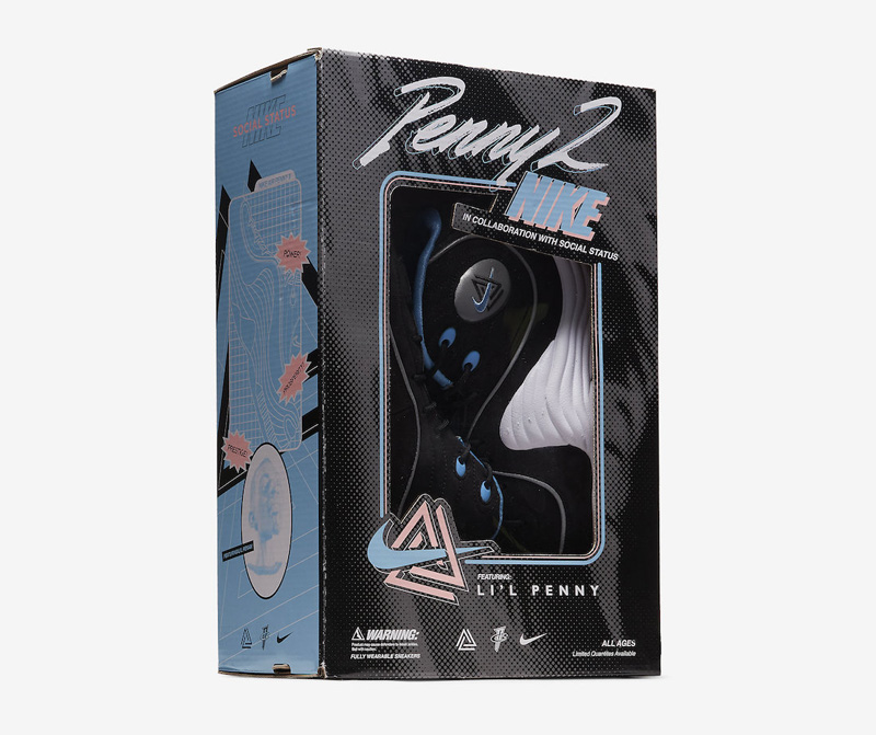 除了鞋款本身,本次联名的鞋盒也是一大亮点,类似于玩具包装风格的设计十分特别,同时随鞋还附赠一个精美的金属材质迷你 Nike Air Penny 2,可见联名鞋款带来的满满诚意。