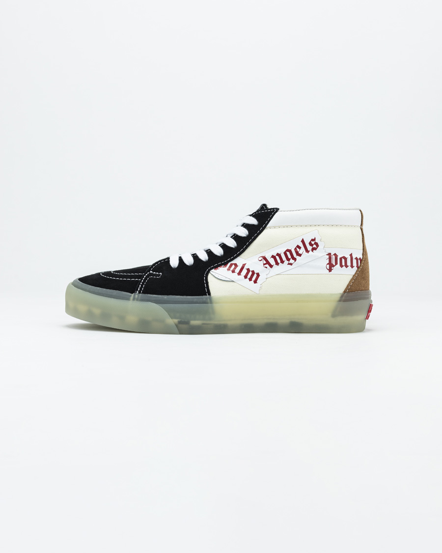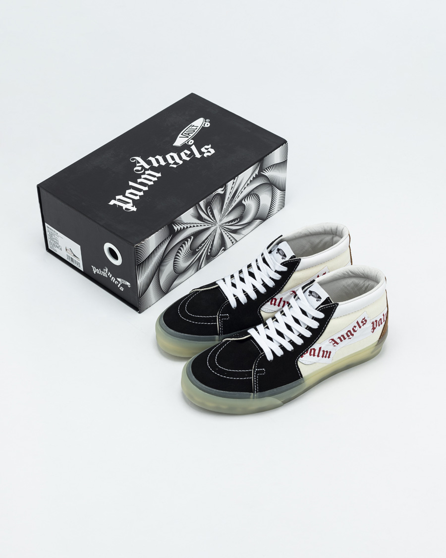全新的 Palm Angels x Vans Sk8-Mid 选择了黑色和米白色拼接而成,造型效果格外低调。