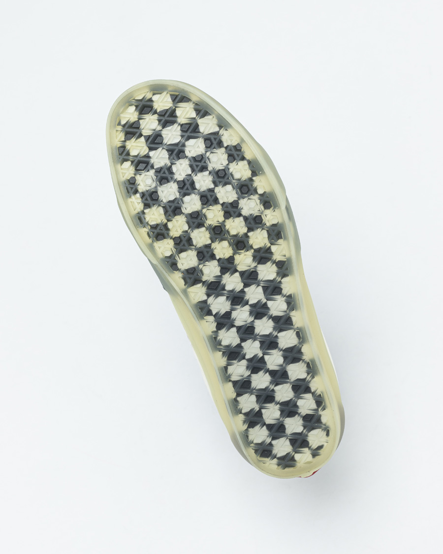 中底部分以轻微泛黄的透明水晶底打造,再加上 Vans 经典的棋盘格元素,充分的将两个品牌的特点展现出来。
