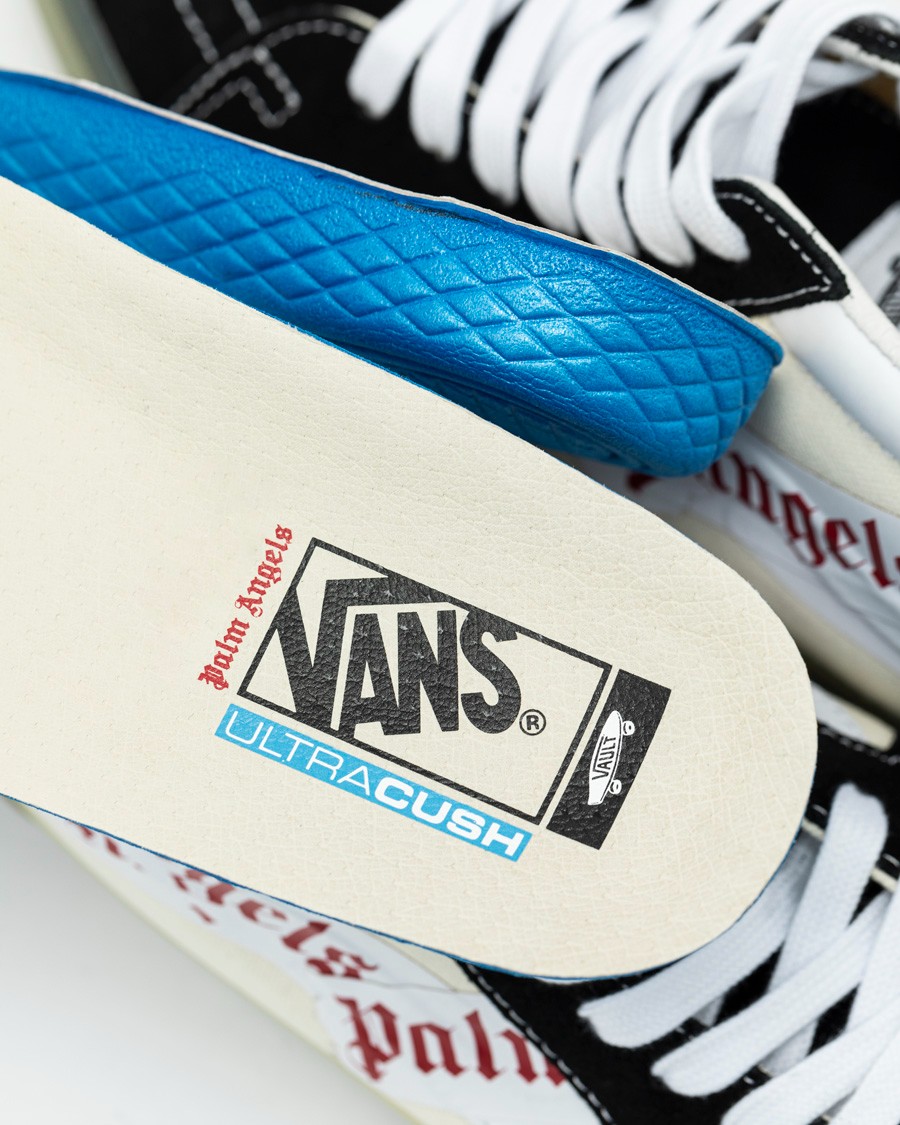 此次联名中最值得一提的莫过于侧身的 Logo 设计,Palm Angels 将印有招牌哥特字母 Logo 的胶带覆盖在 Vans 的条纹 Logo 之上,并将其摆放成侧边条纹的样式,将自己的联名身份展露无遗。