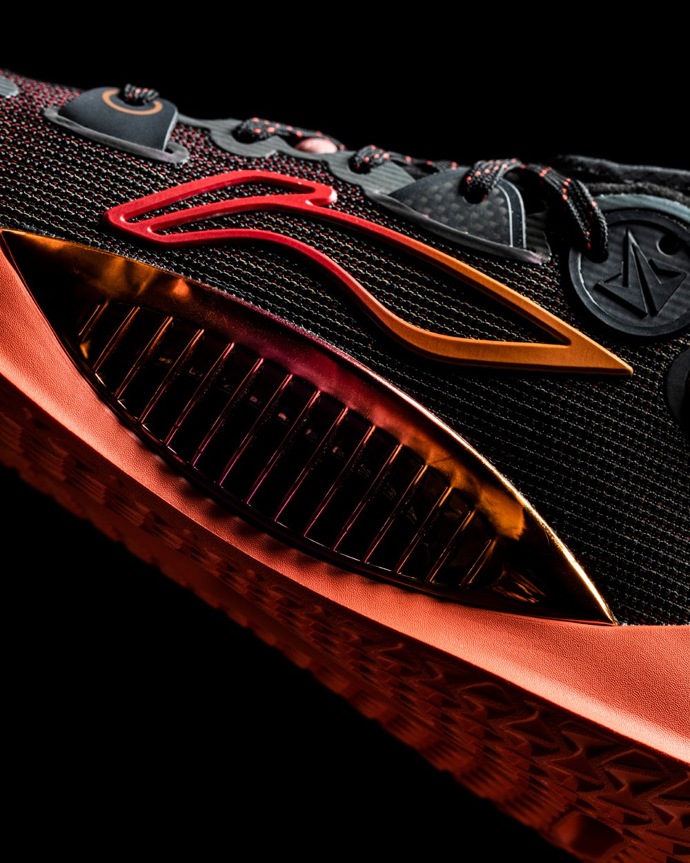 侧身渐变造型的李宁 Logo,选择了从红到黄的渐变设计和一块超大的电镀 TPU 补强,既提升了颜值又增加了鞋身抗扭。