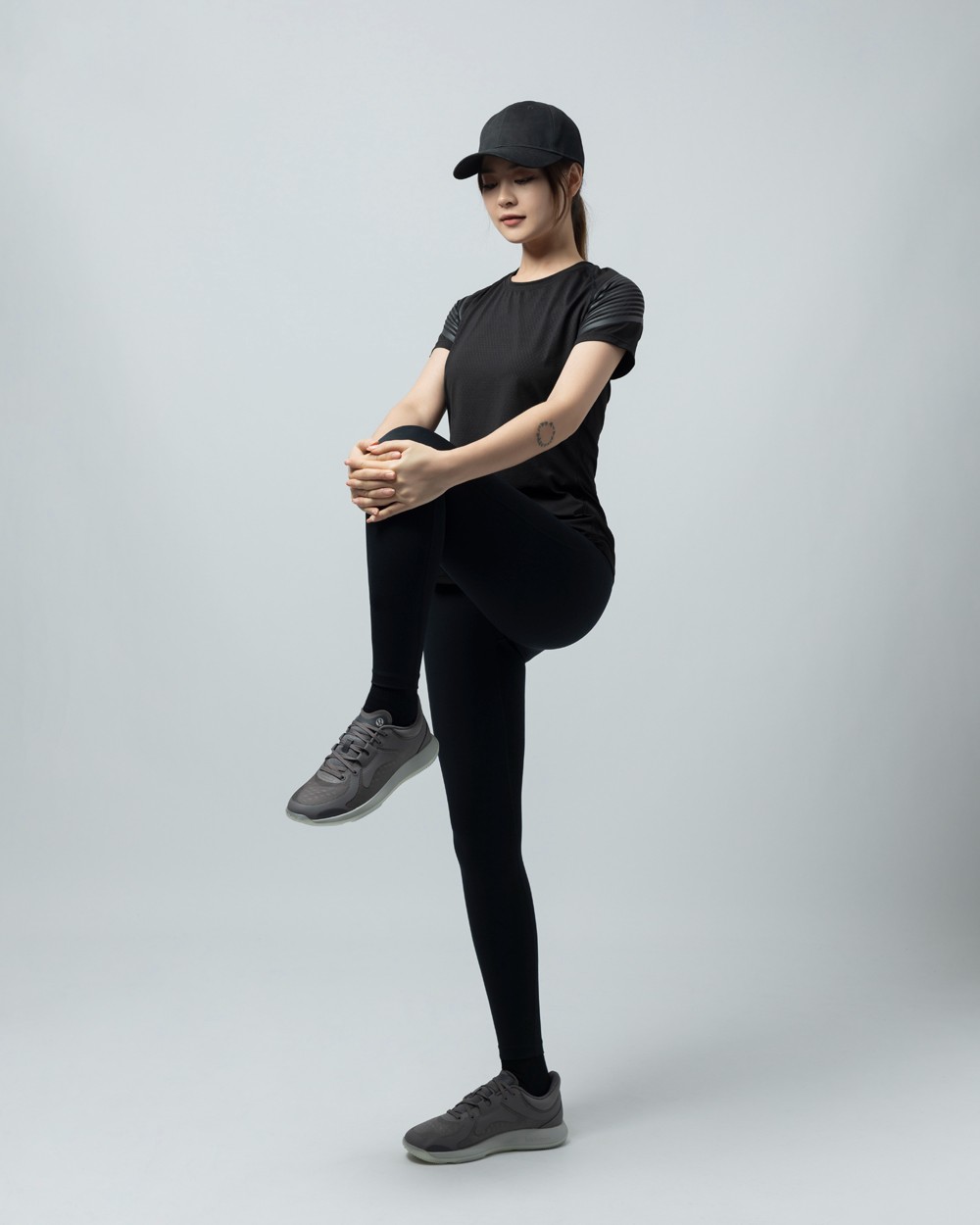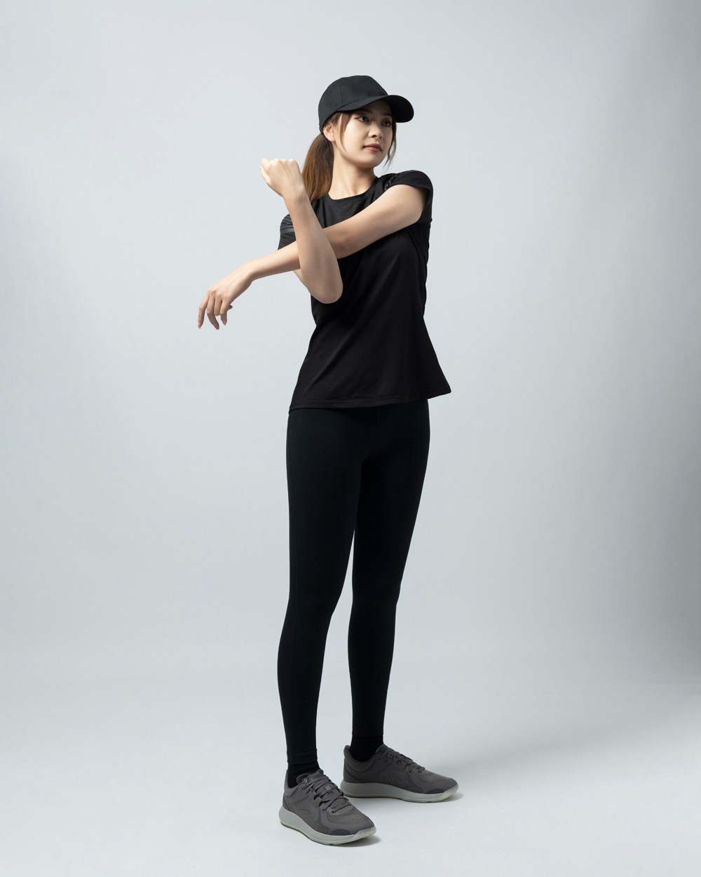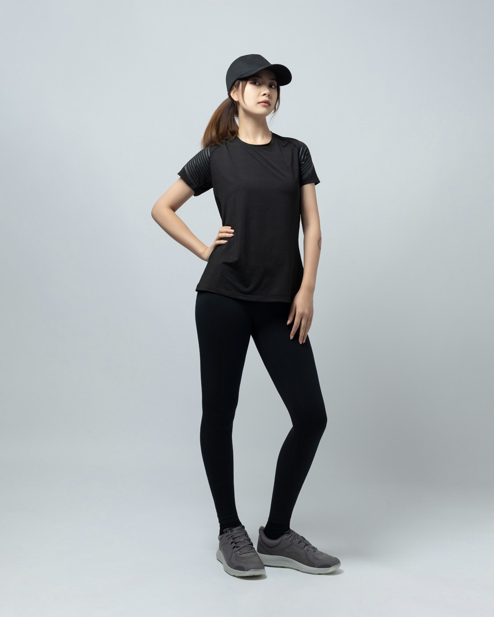 上脚搭配方面,选择一条黑色健身裤,简约利落,有不错的运动感。