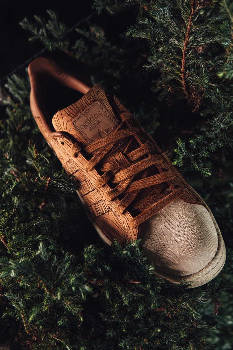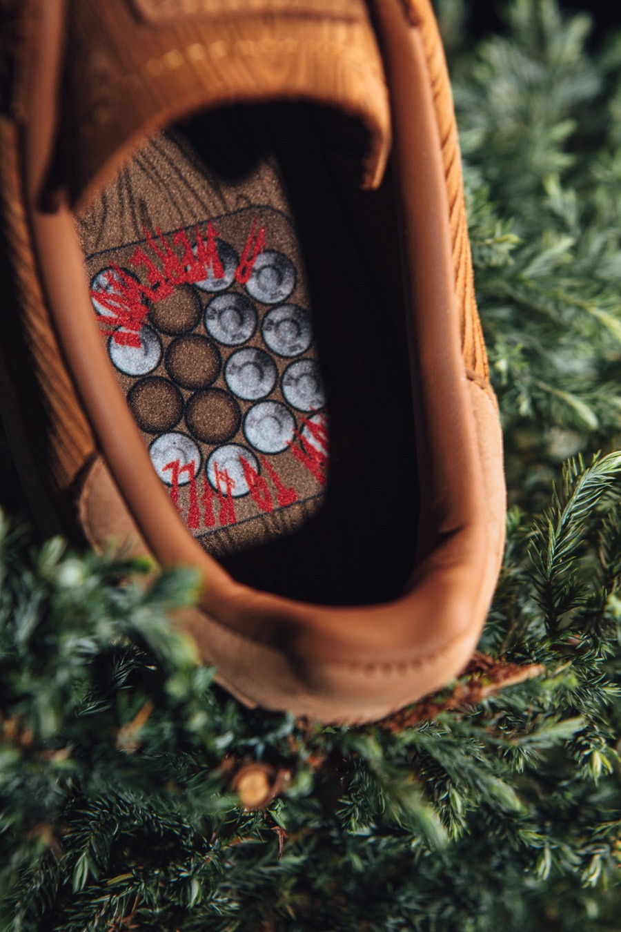 第一双以吸血鬼惧怕的「木钉」为主题进行设计,鞋身通体选择了深棕色呈现,同时辅以木纹纹理,呼应整鞋的设计灵感。
