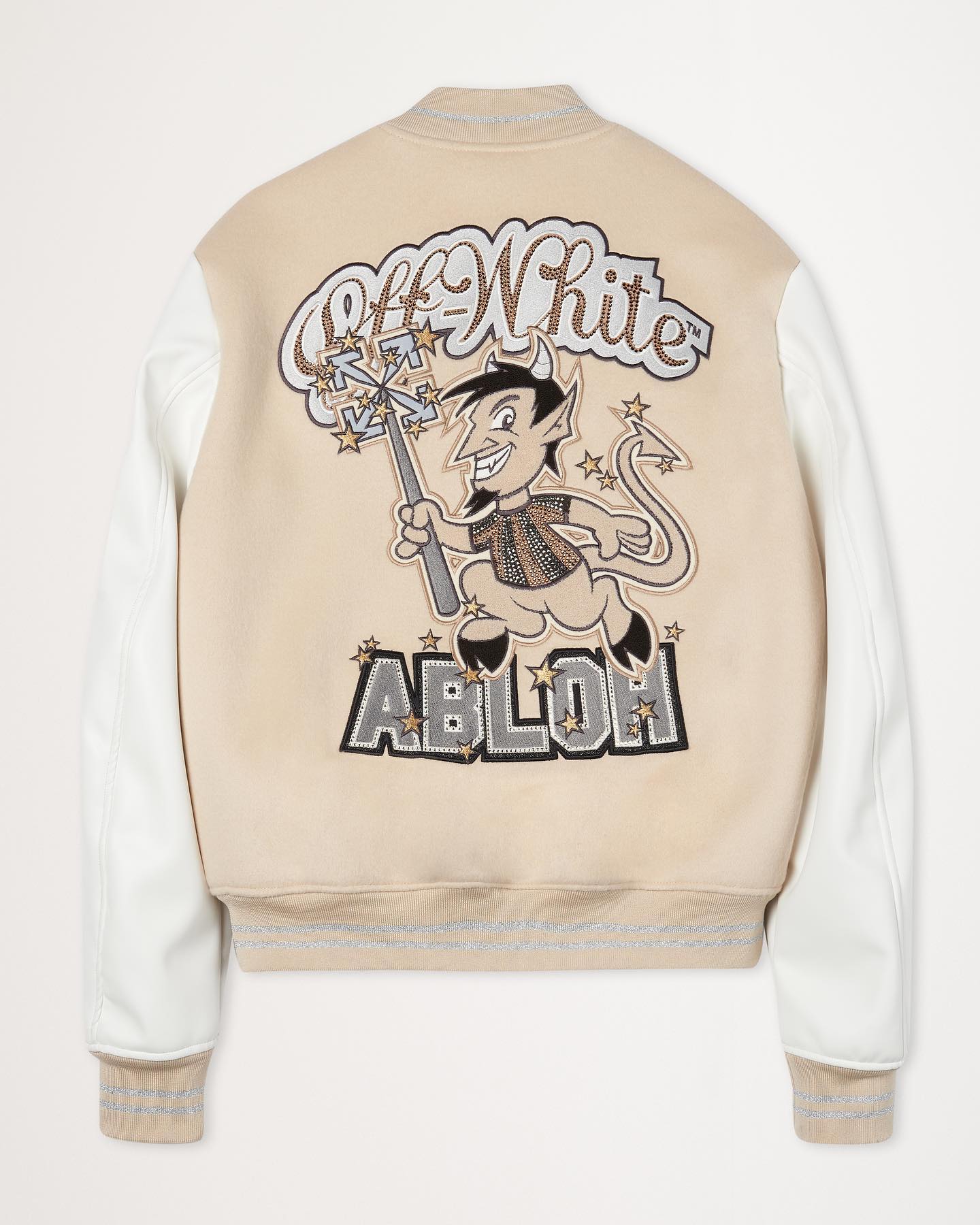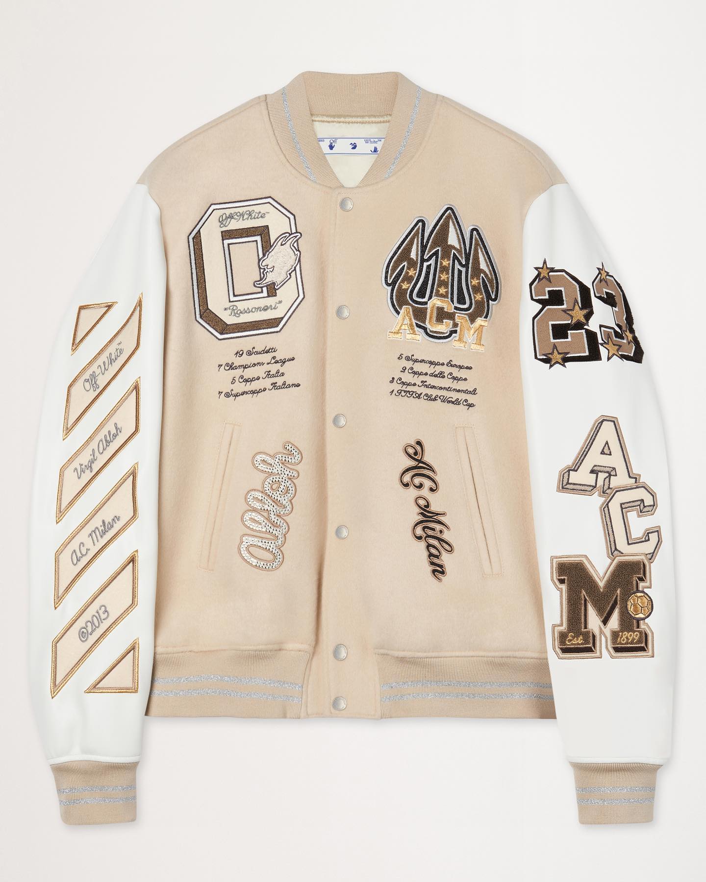 全身由白色皮革覆盖,印有图形装饰贴片设计,其中包括右袖上经典的 OFF-WHITE 条纹和左袖上的 “ACM” 字样。