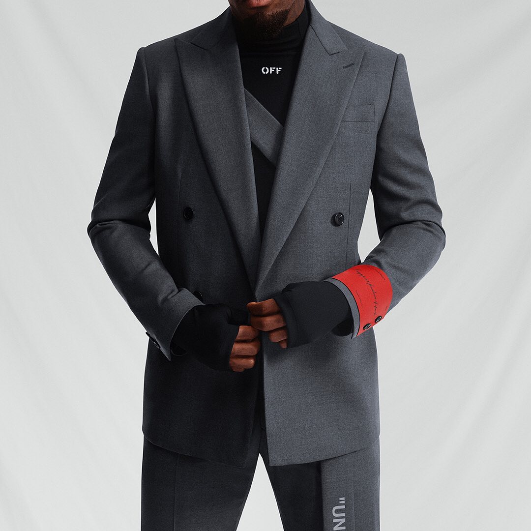 要说最吸引人的那一定是休闲制服中的外套了。西装外套则由品牌创始人 Virgil Abloh 推崇的具有OFF-WHITE 风格标志的 Varsity 夹克所取代。
