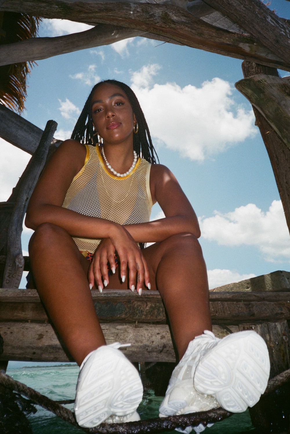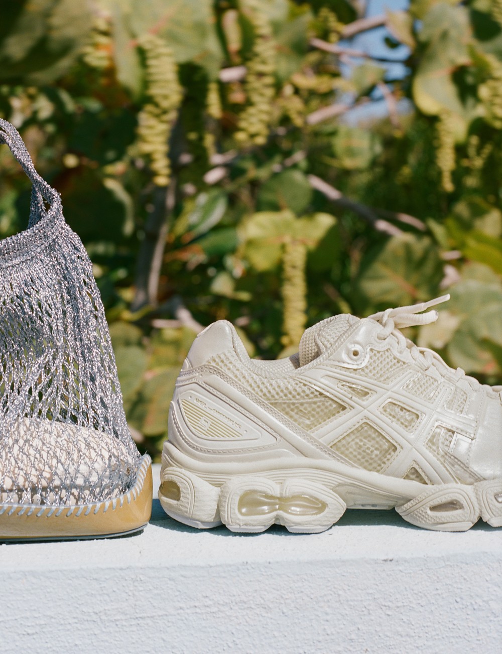 设计灵感来源于 Jessica Gonsalves 本人对航海的热情,配色选用代表海洋珍珠的米白色,中底部分以半透明饰片点缀,营造出珍珠般透亮的光泽。