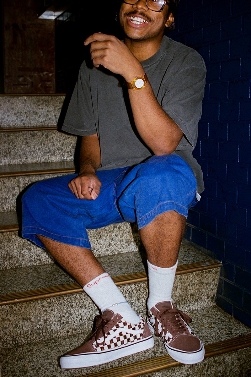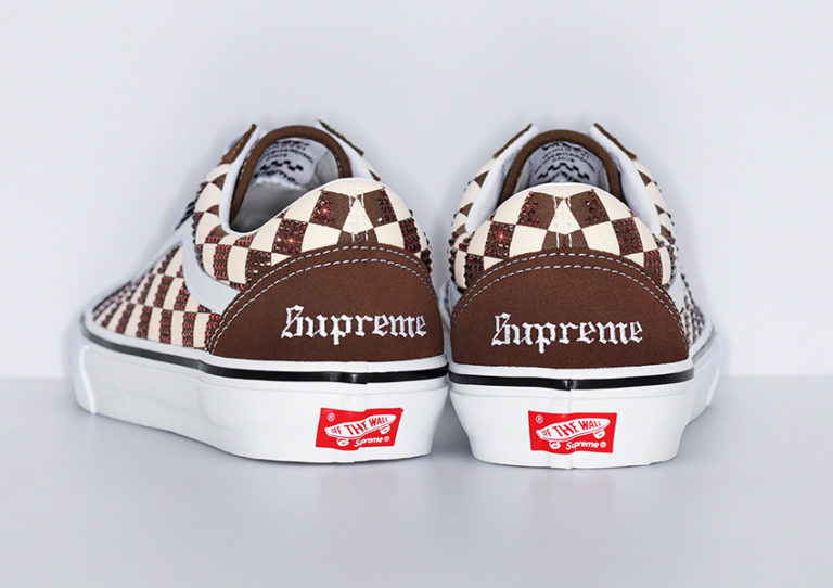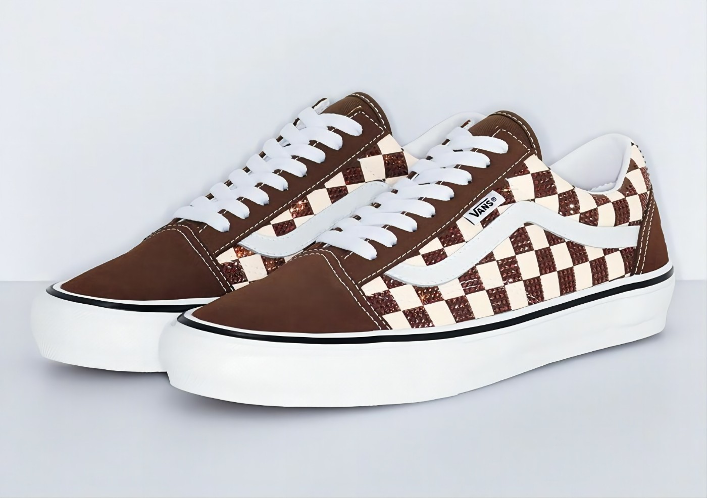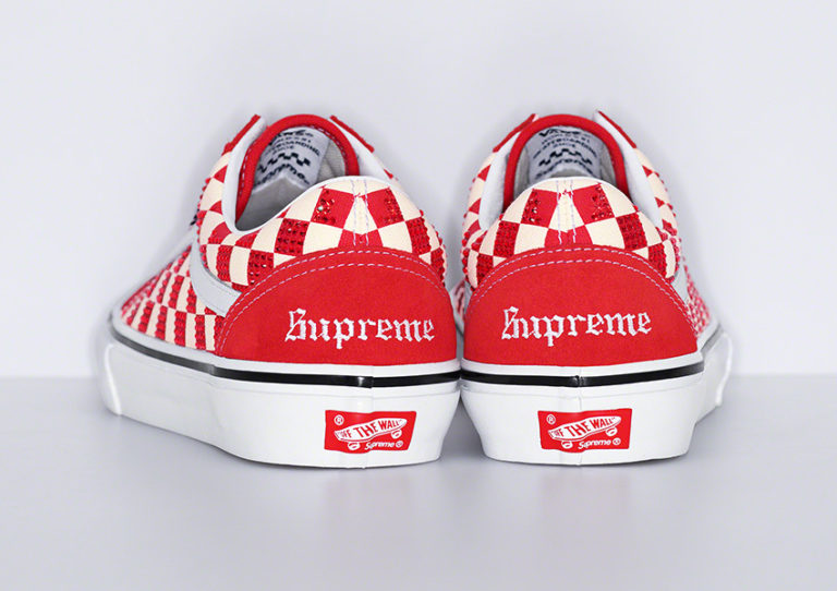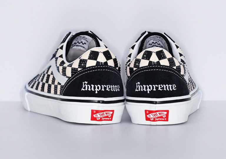 Supreme 与 Vans 这对黄金组合同样保持着紧密的合作关系,近日一款 Supreme x Swarovski x Vans 三方联名鞋款释出实物和上脚,确认将于本周发售。