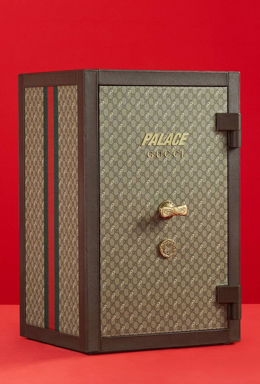 对比 50 台的限量摩托车,保险箱仅仅只生产了 10 件,辅以满印全皮革材质包裹,还在正面用金色点缀了 PALACE 和 GUCCI 字样,彰显联名身份的同时,也将其奢华指数拉满。