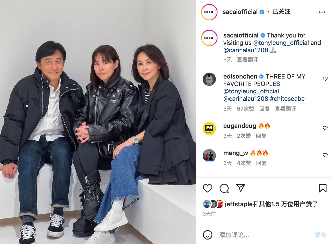 sacai 官方 Ins 晒出了梁朝伟、刘嘉玲夫妇与阿部千登势的合影。