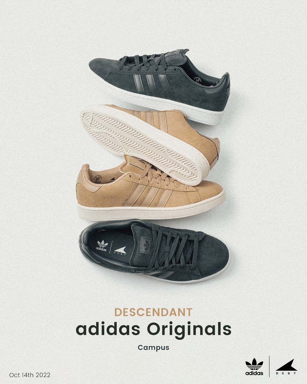 两款全新的 DESCENDANT x adidas Originals 同样以 Campus 为蓝本进行设计,带来出众的复古造型,仿佛重回 90 年代的氛围。