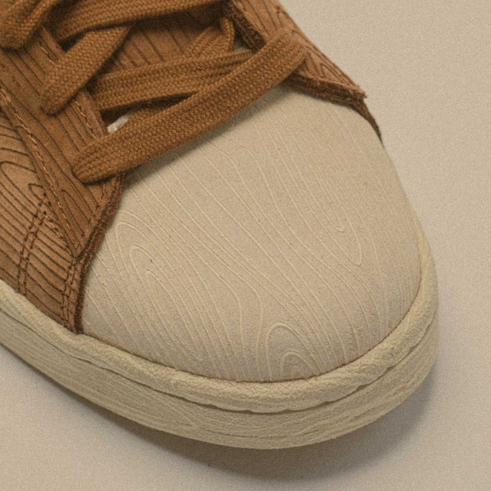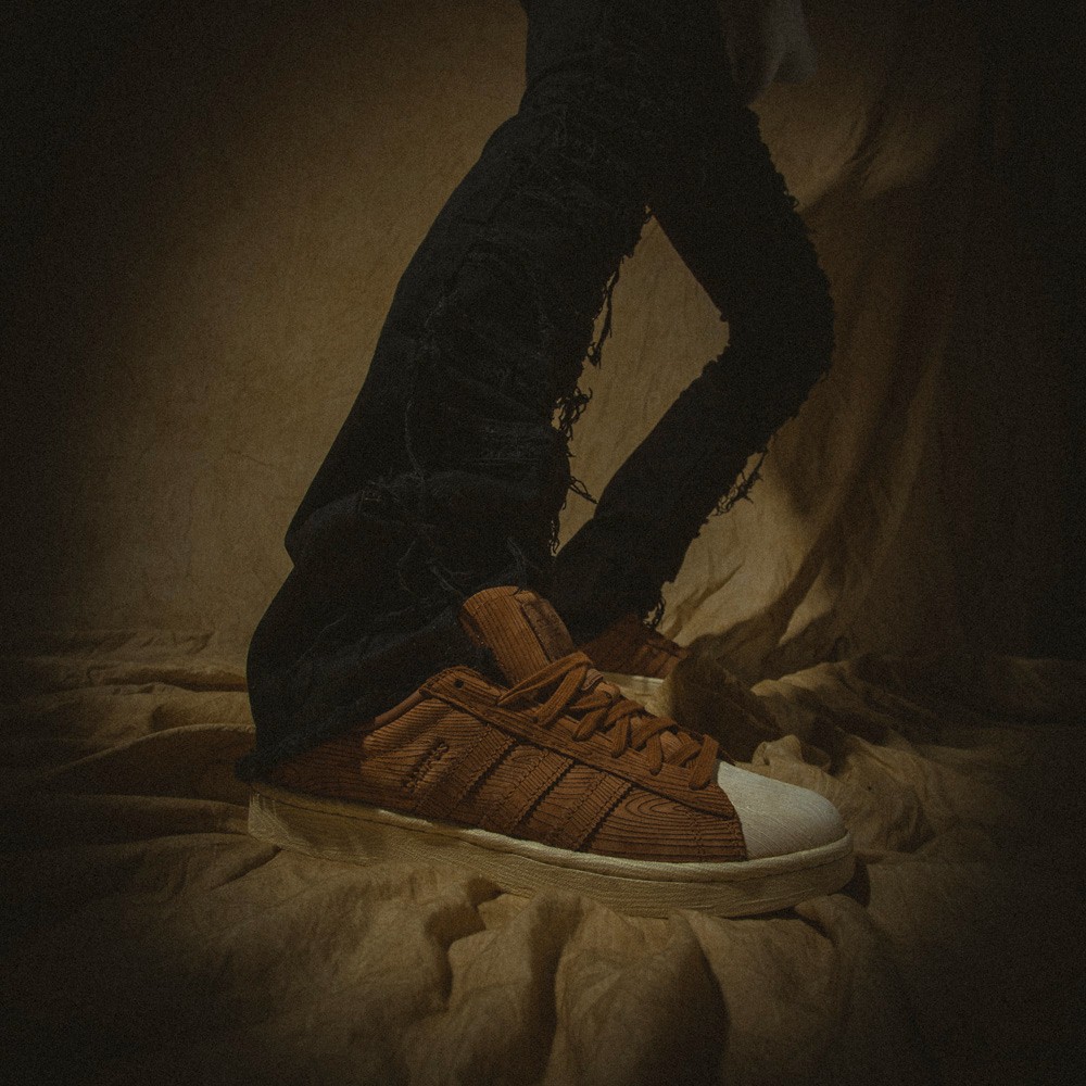 第二双以吸血鬼惧怕的「木钉」为主题进行设计,鞋身通体选择了深棕色呈现,辅以米白色鞋头,同时还带有木纹纹理,呼应整鞋的设计灵感。