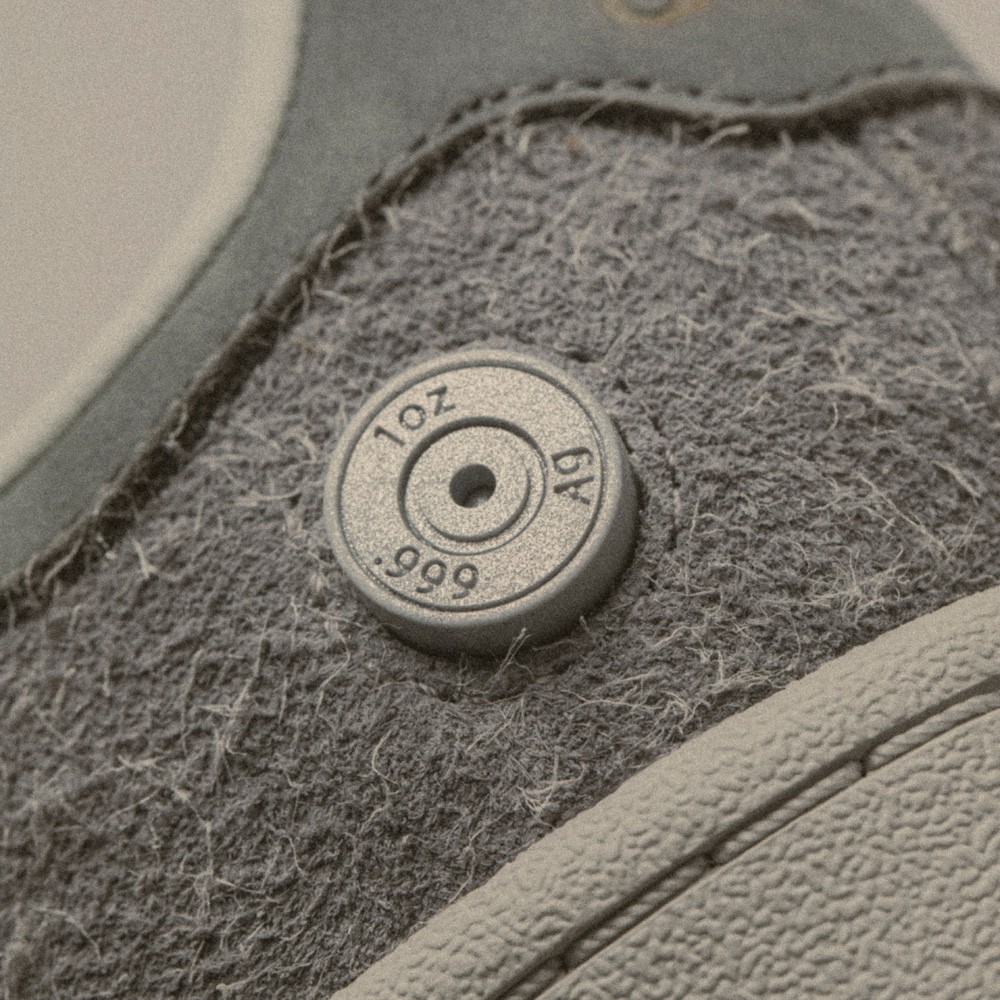 第一双以「银色子弹」为灵感进行创作,整双鞋选择了灰色为主调,鞋面的长绒麂皮与普通麂皮显示出了特殊配色的高级质感。