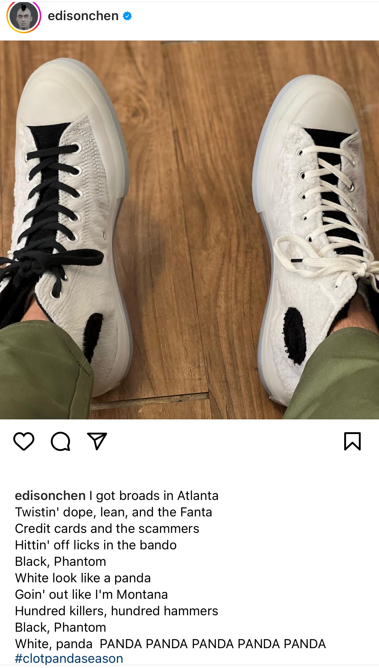 晒出上脚图的同时,并配文 Desiigner 爆红单曲 《Panda》歌词,同时文末标注有 clotpandaseason,结合此前冠希哥曾晒出的 CLOT 熊猫玩偶图片,似乎不仅仅只有这一款联名鞋这么简单。
