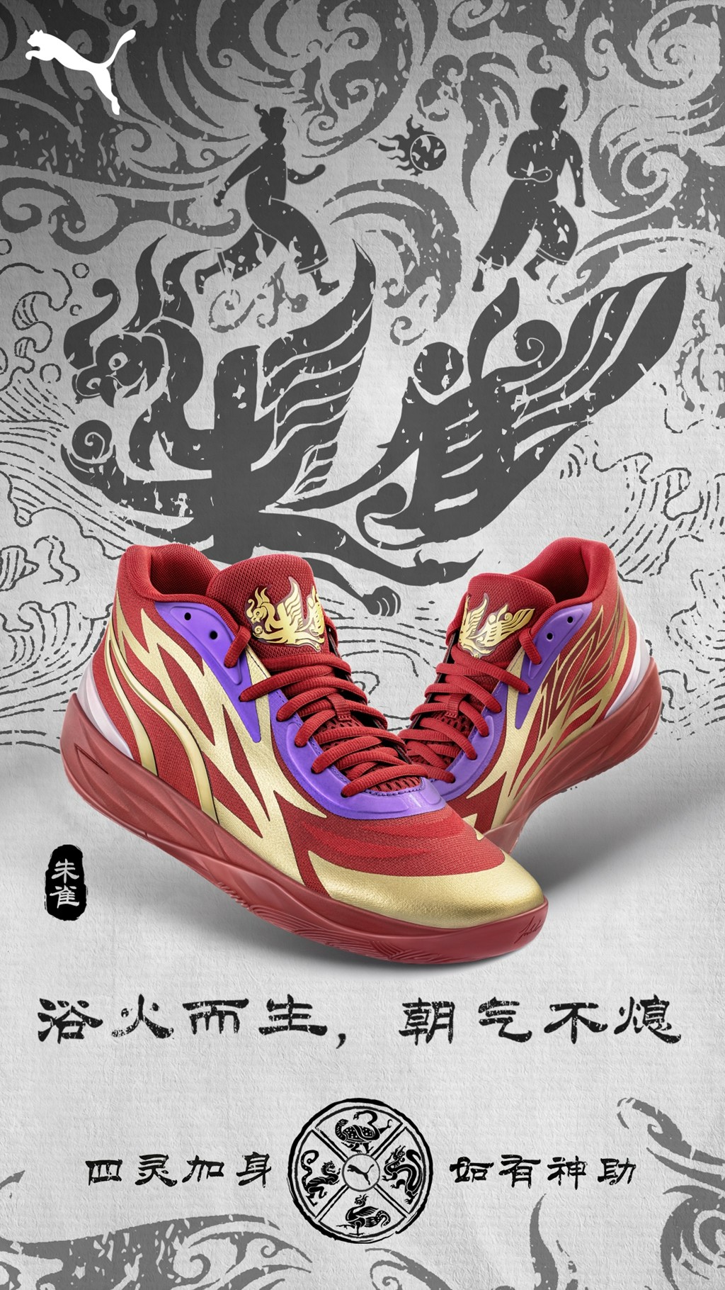 鞋舌上的细节十分特别,PUMA 专门请来跨媒体艺术家朱敬一来负责图案的设计,将 “朱雀” 两字和神兽图腾相结合,创造出酷似古代象形文字的艺术作品,并融合进汉代“四神纹瓦当”的风格之中。