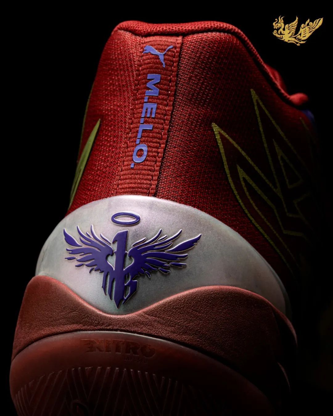 后跟上下分别点缀 M.E.L.O. 字样,和拉梅洛独特的个人 Logo,彰显球鞋主人身份。