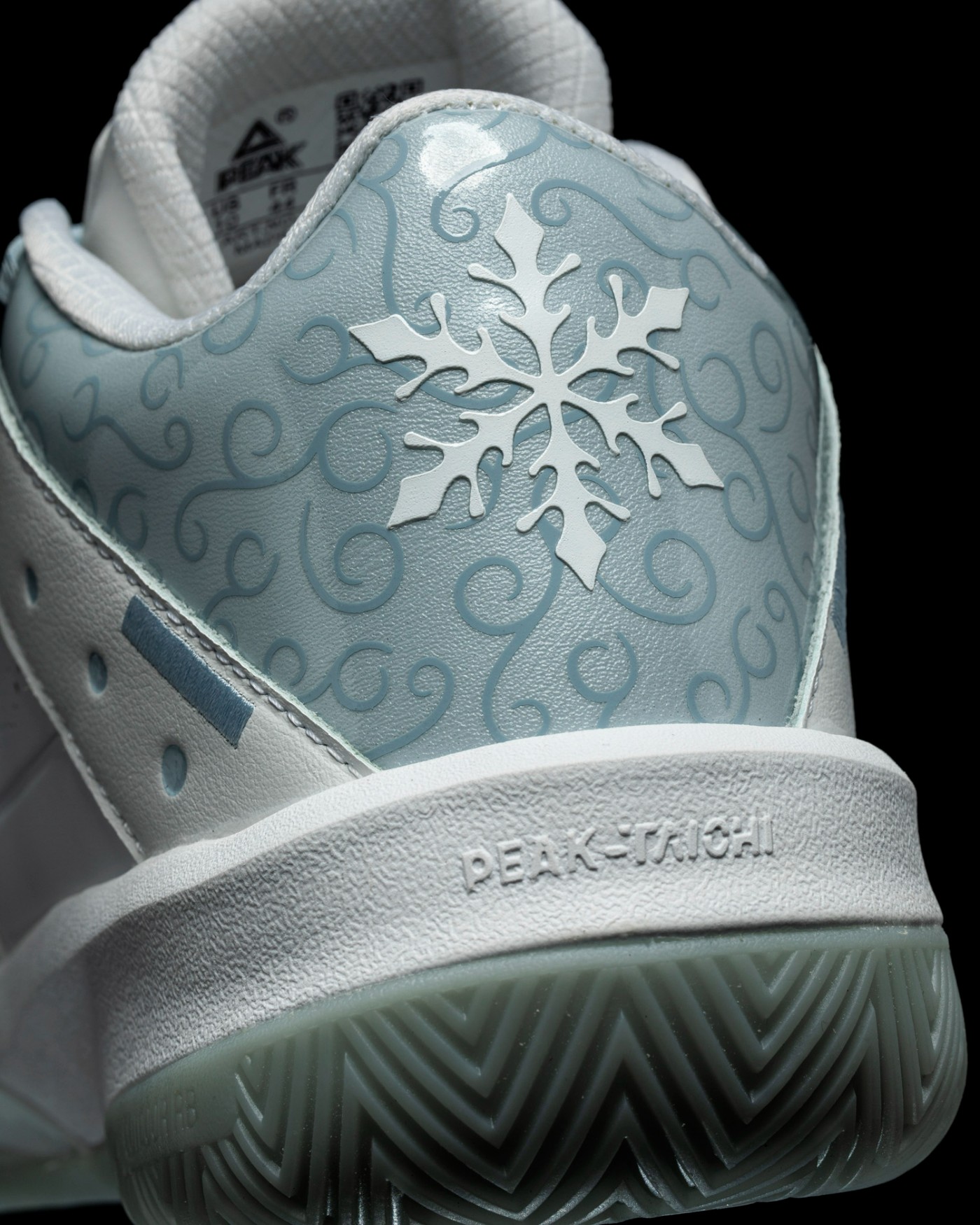 最亮眼的细节在于后跟,大片雪花覆盖在寒气般的花纹上,彰显配色主题。