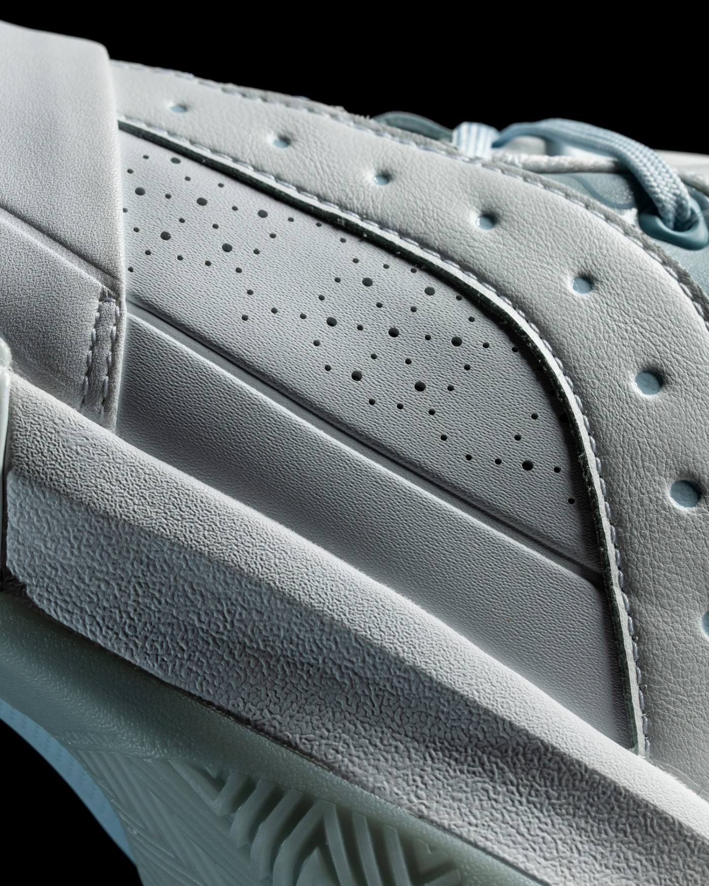 颜值上,冰雪主题配色一直都有着超高人气,白色、冰蓝的搭配永远都不会出错,清爽又百搭,另外在鞋侧还有雪花形的冲孔,带来一定的透气功能。