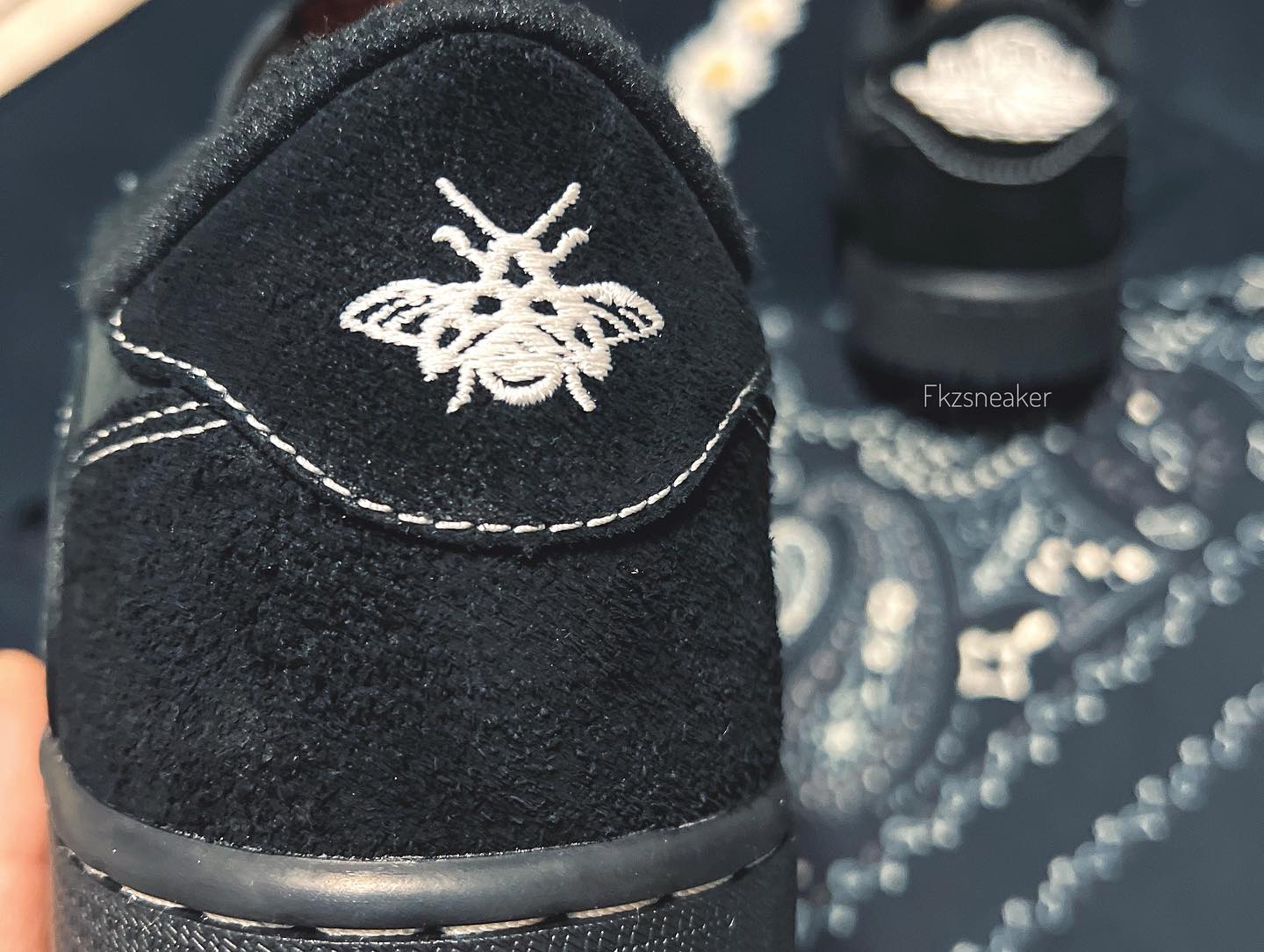 右脚后跟则延续了传统 Air Jordan 飞翼标志,特别之处在于左脚后跟采用代表 Travis Scott 女儿的蜜蜂刺绣取代了笑脸图案。