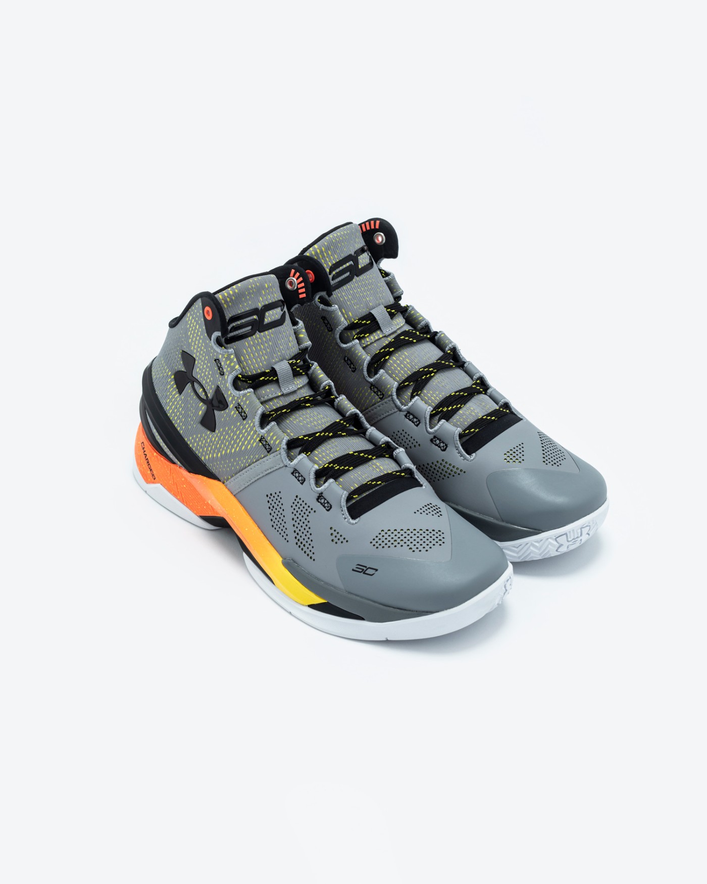 礼盒中的另一双 Under Armour Curry 2 同样以「百炼成钢」配色示人,大面积的灰色,辅以红黄渐变 TPU 和黄色斑点。