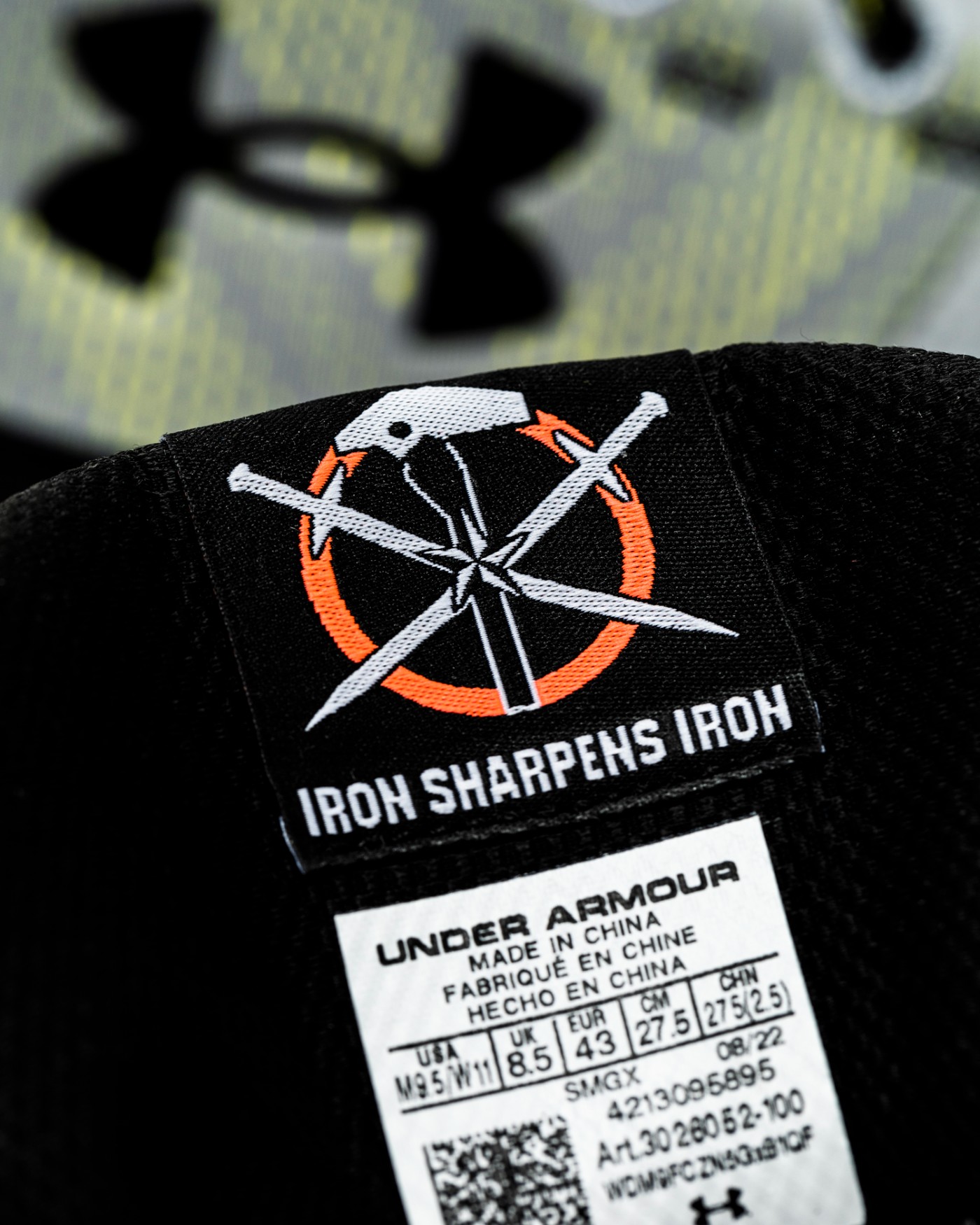 鞋舌上带有原版的 Curry Logo,内侧添加有代表着百炼成钢的 Logo 和「IRON SHARPENS IRON」字样。