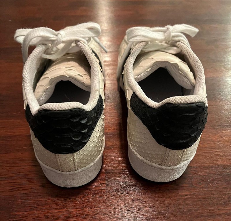 整双鞋选择了乳白色呈现,材质则十分亮眼采用全蛇纹皮革打造,造型十分奢华。