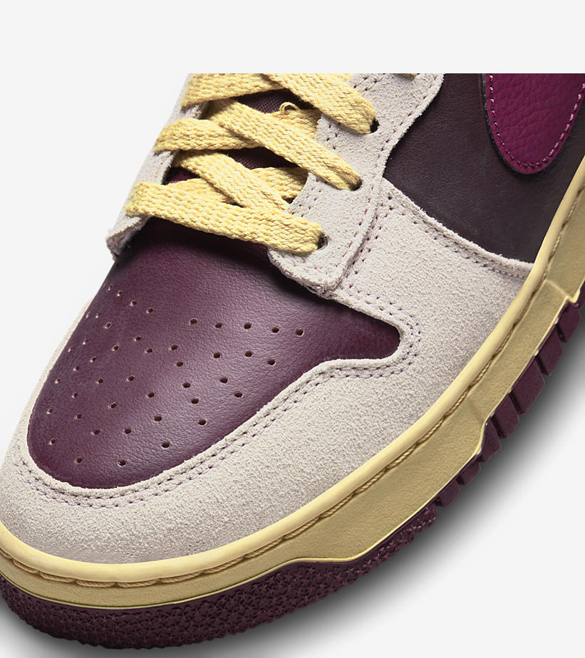 这款配色采用暗紫色皮革打造,搭配翻毛皮鞋头以及发黄的鞋帮皮革。