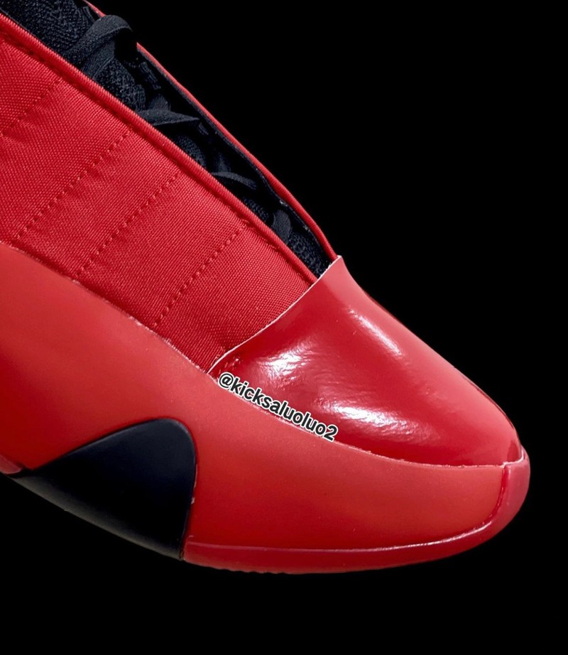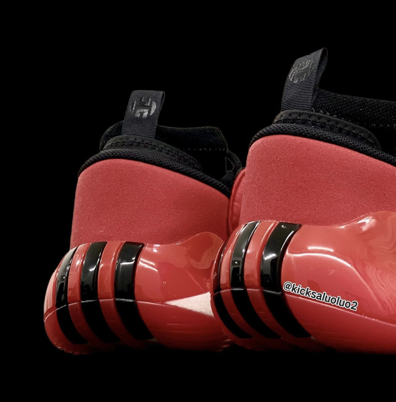配色方案也以红色为主调,辅以黑色妆点细节,鞋头部分的漆皮补强,很难不让人想起 adidas Harden Vol. 1 的鞋面设计。
