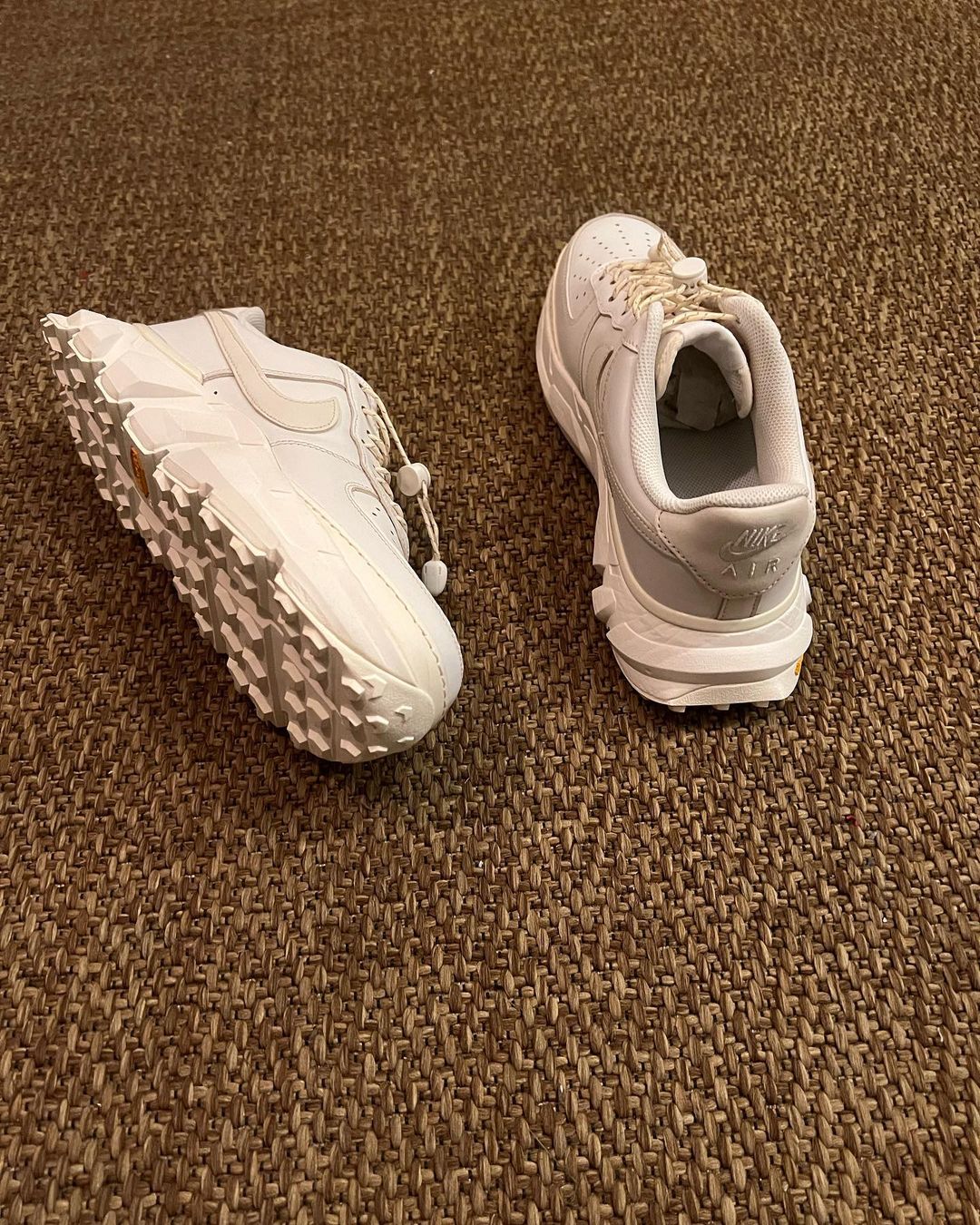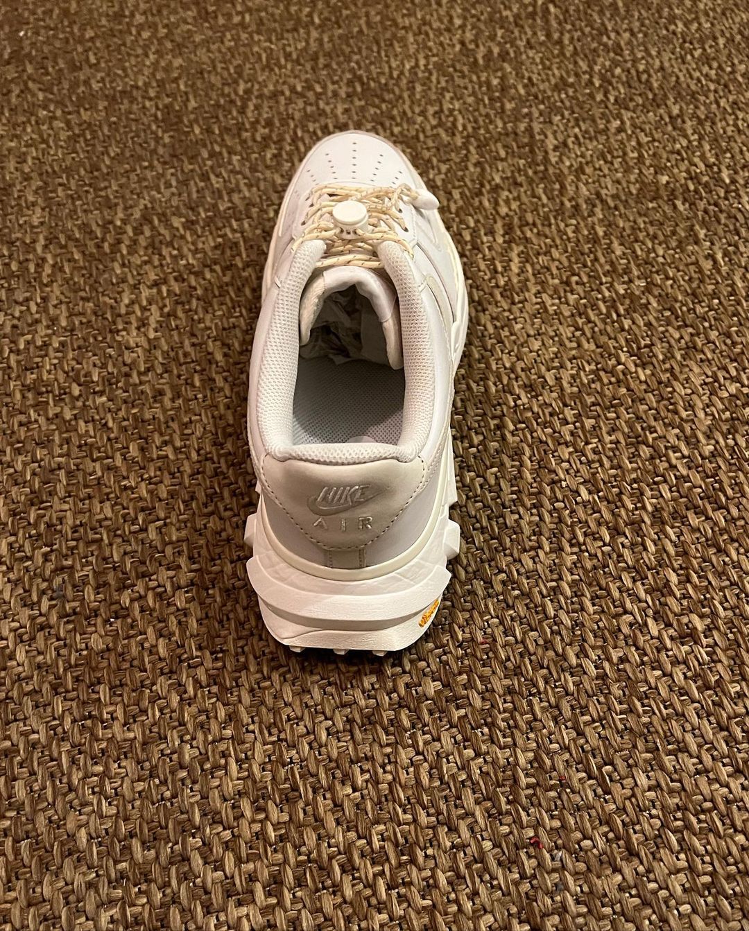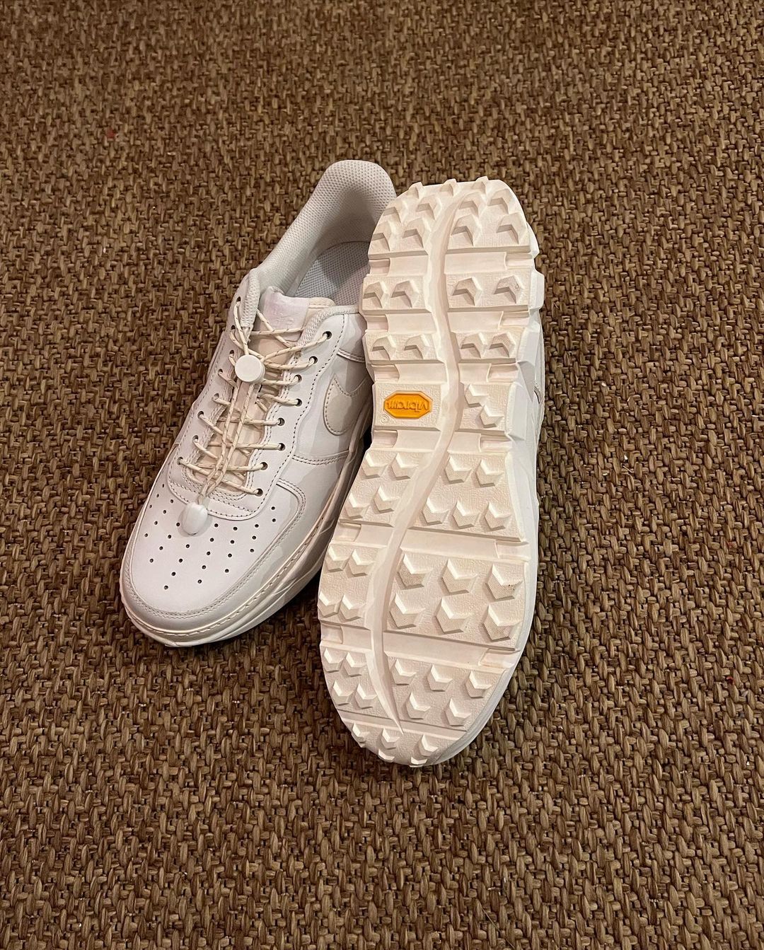 先来看第一款纯白配色,从图中可以看到鞋身是大家熟悉的 Air Force 1 轮廓,最大的特点是鞋底换成了 Vibram® 黄金大底,带来更强的抓地力。