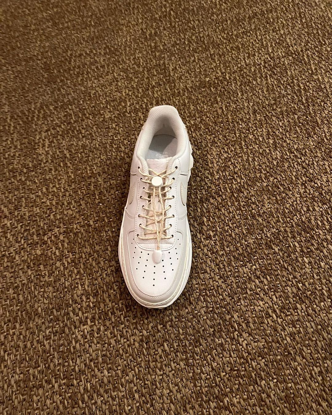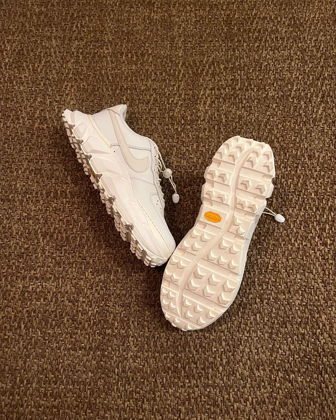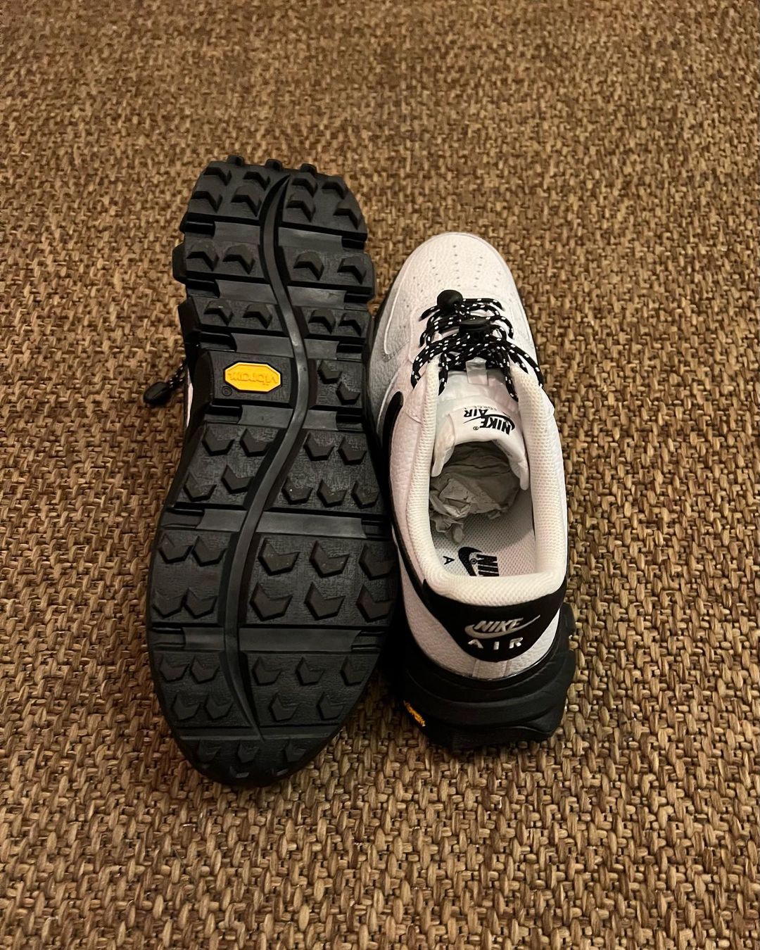 先来看第一款纯白配色,从图中可以看到鞋身是大家熟悉的 Air Force 1 轮廓,最大的特点是鞋底换成了 Vibram® 黄金大底,带来更强的抓地力。
