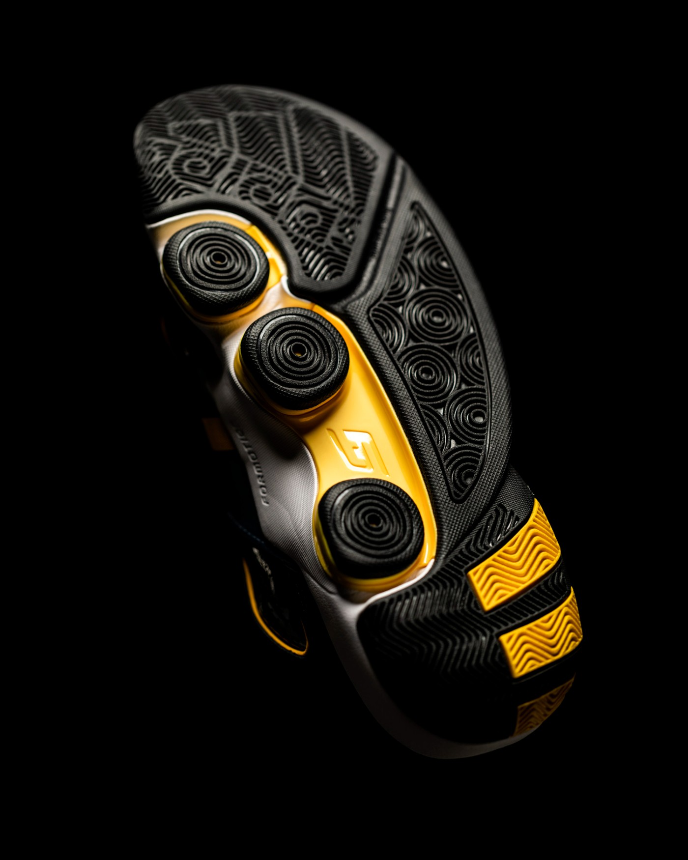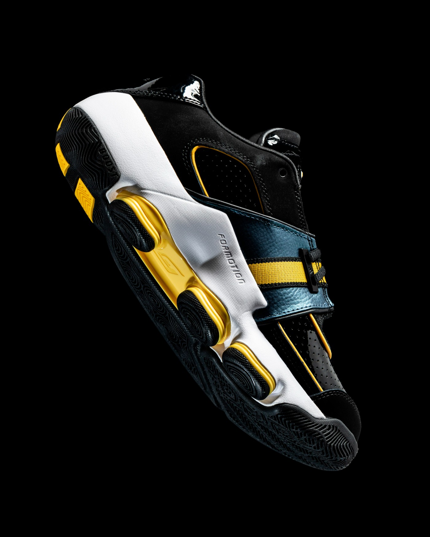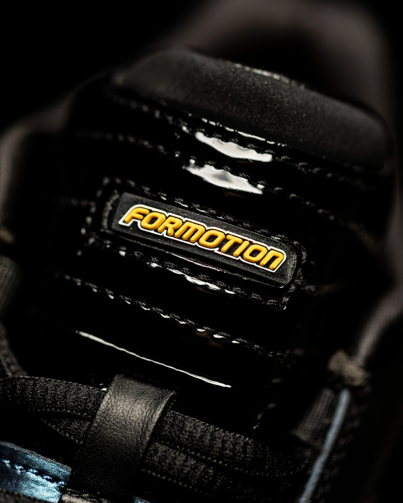 镜面般的漆皮材质从鞋头一直延续到鞋舌,上面点缀黄色 “FORMOTION” 字样。