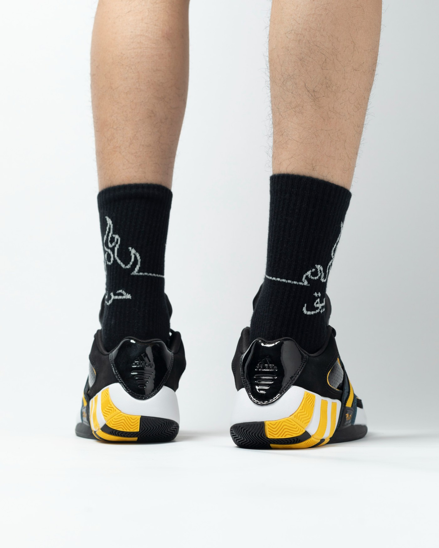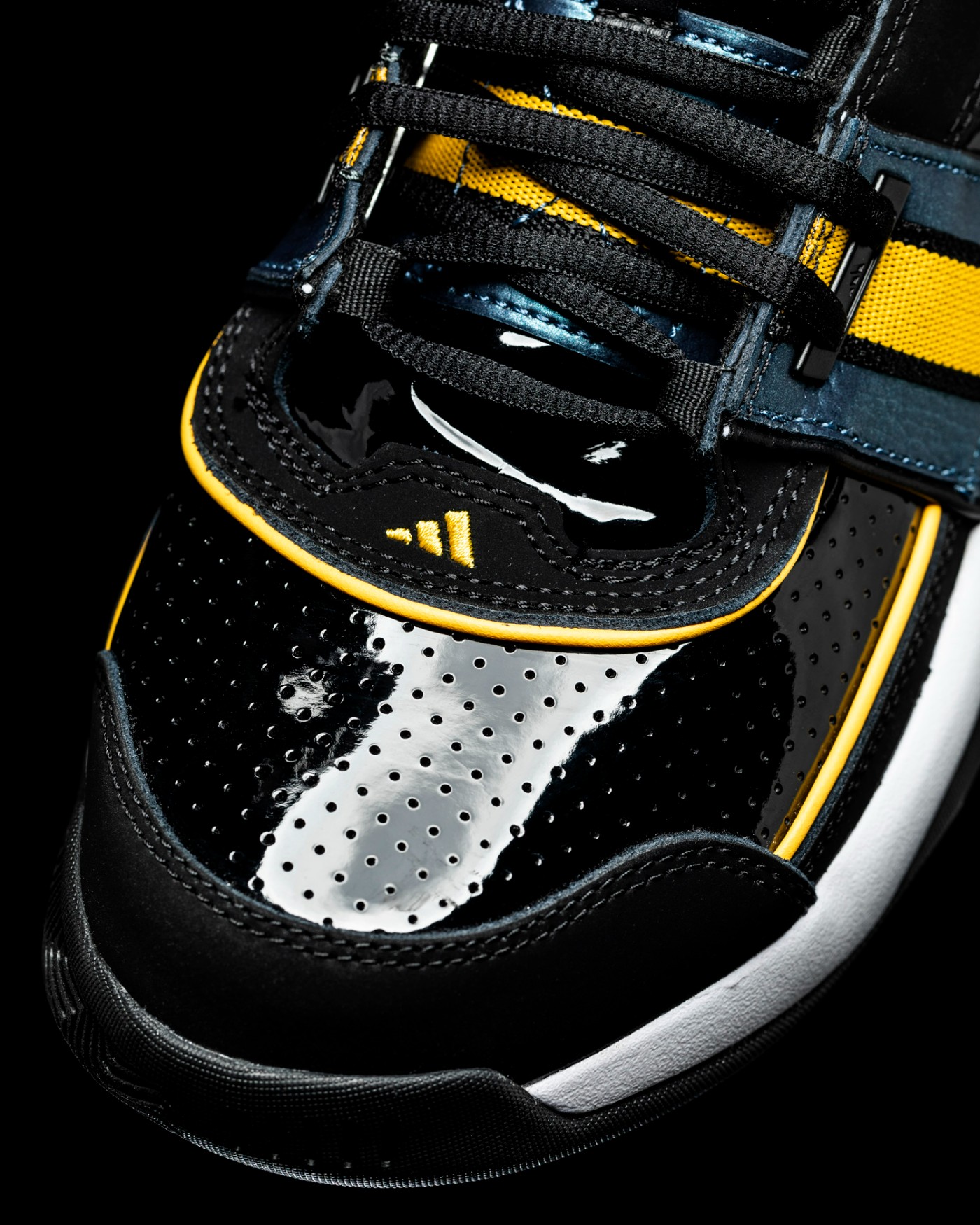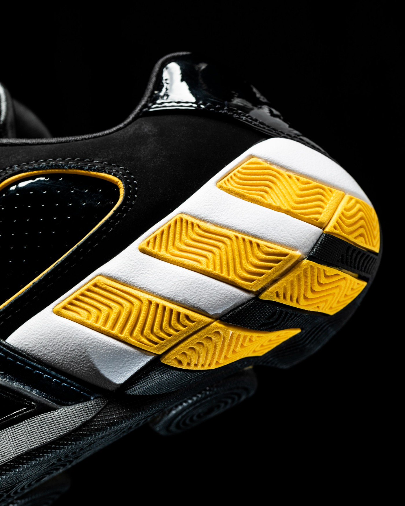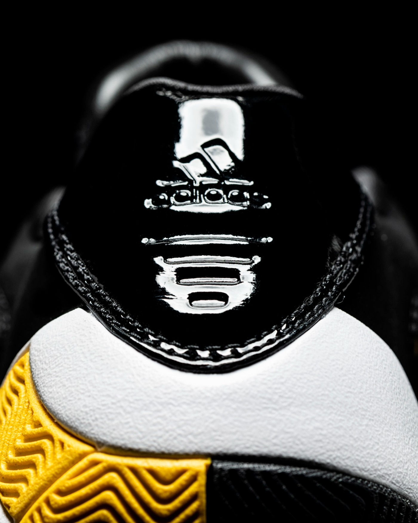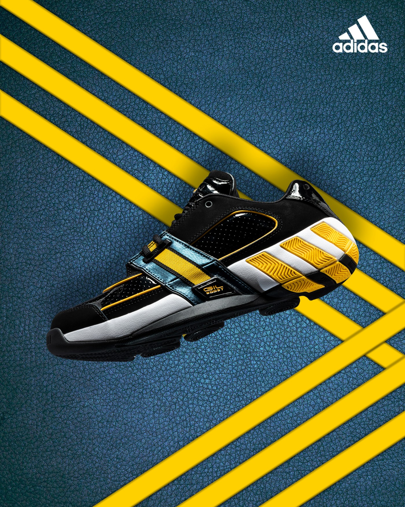 后跟的黑色漆皮上,利用压印工艺印出 adidas Logo,若隐若现。