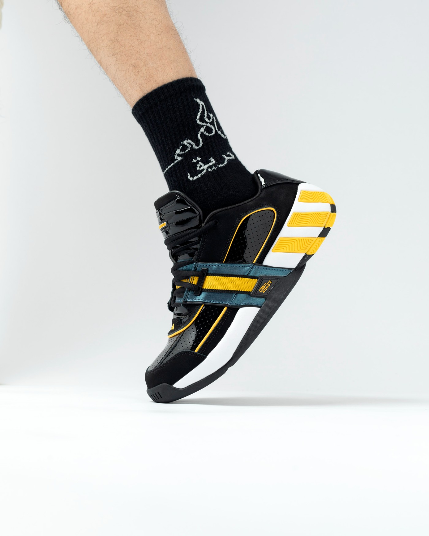整双鞋采用经典黑色为主色,黄色和蓝色点缀,致敬当年奇才队的球衣主题。
