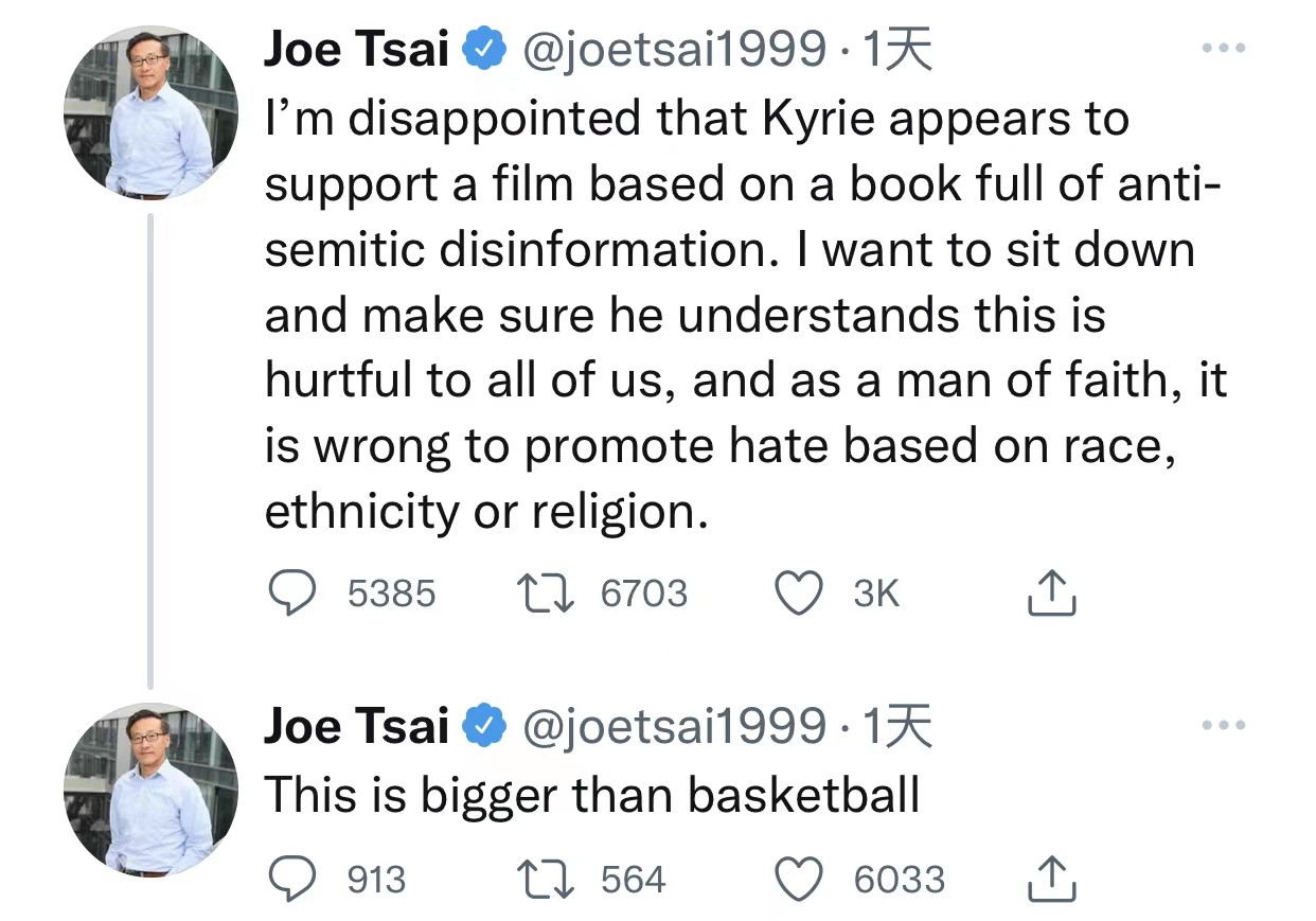 篮网老板蔡崇信三小时后火速发文,对欧文的行为表示失望。