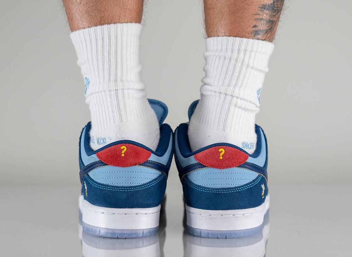 后跟原本 Nike 刺绣字样被问号替代,与 Why So Sad? 的联名主题呼应。