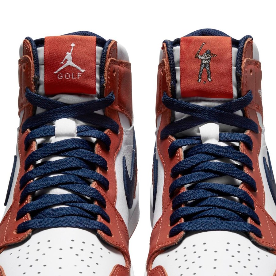 以 Air Jordan 1 为蓝本,鞋底采用高尔夫球鞋纹路,并且在鞋舌上有象征双方的品牌标志。