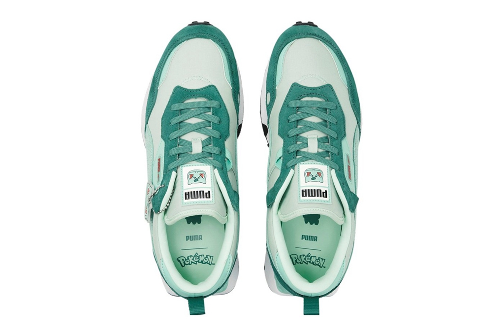 皮卡丘和妙蛙种子的 PUMA Rider FV modern classic 更是在侧面跑道 Logo 上加入闪电和龟裂的质感。