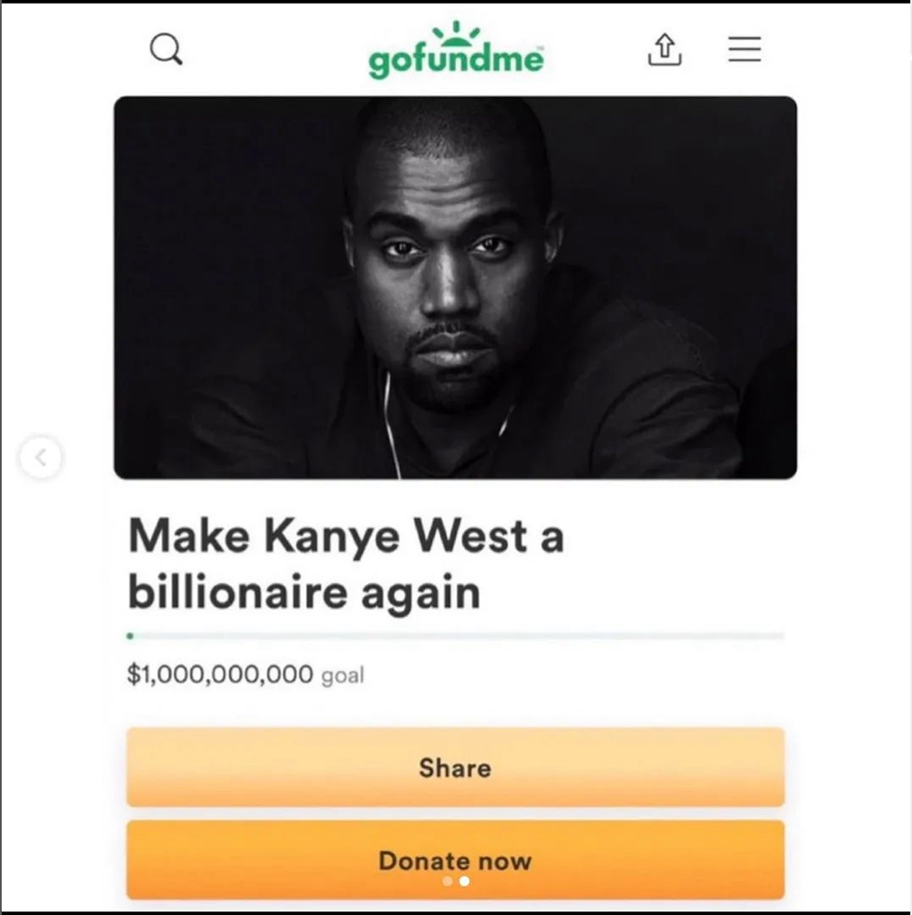 仔细一看,募捐的主题叫「Make Kanye West a billionaire again(让侃爷重回亿万富翁)」。