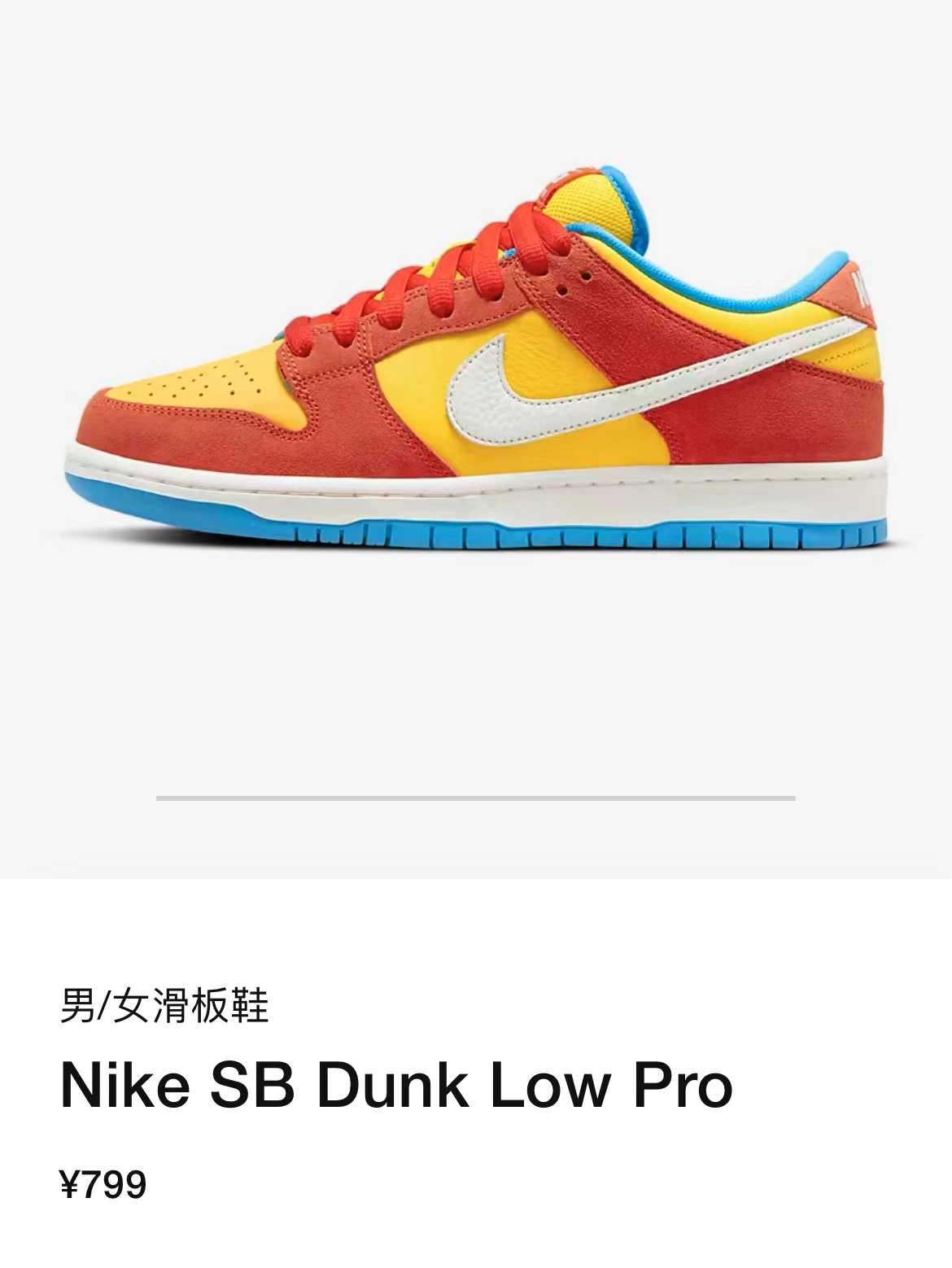整双鞋配色以鲜艳醒目的红、黄、蓝撞色呈现,酷似《辛普森一家》的主角巴特·辛普森的形象。