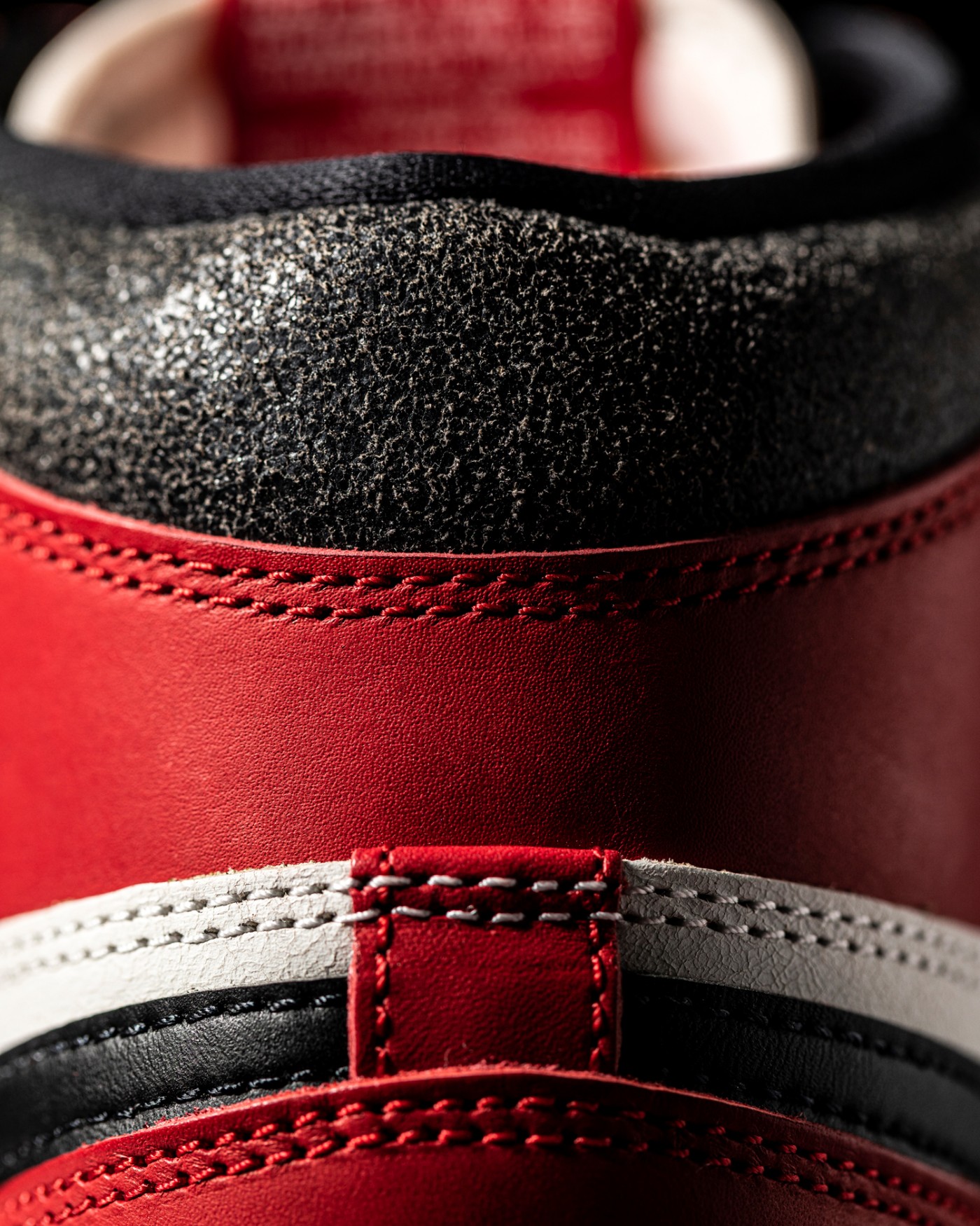 从小编拿到的这双实物来看,2022 款的 Air Jordan 1 Retro “Chicago” 无论是皮革的细腻程度,还是色调的准确还原上,都有着不俗表现。