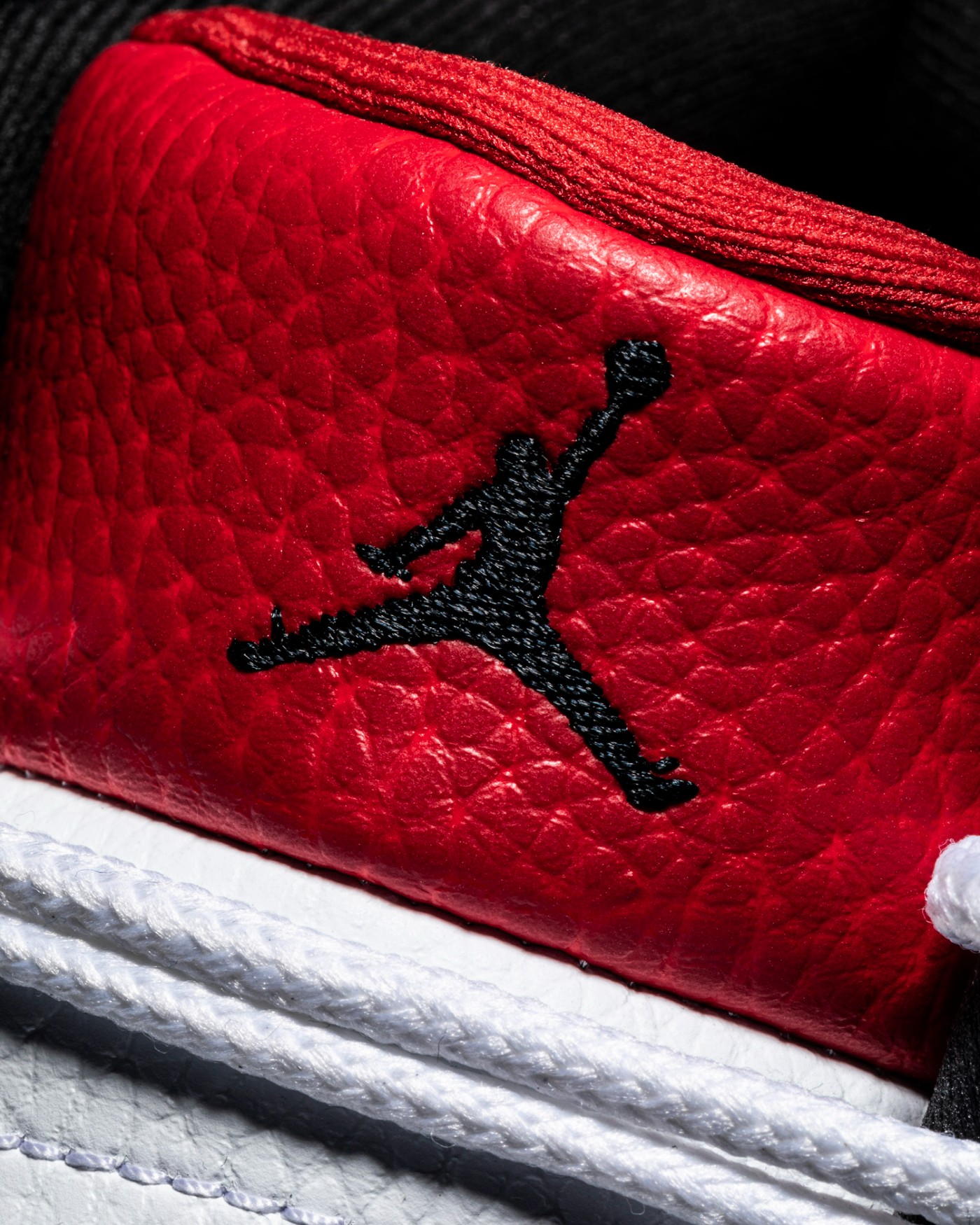 红色鞋舌上绣有黑色 Jumpman Logo,皮革上的荔枝皮颗粒清晰可见。