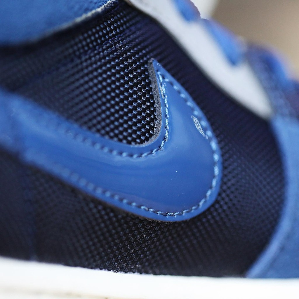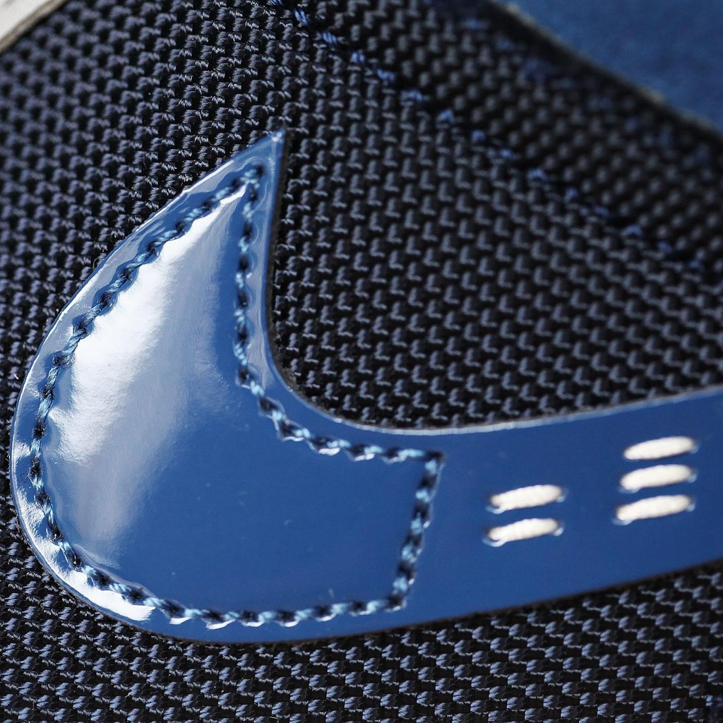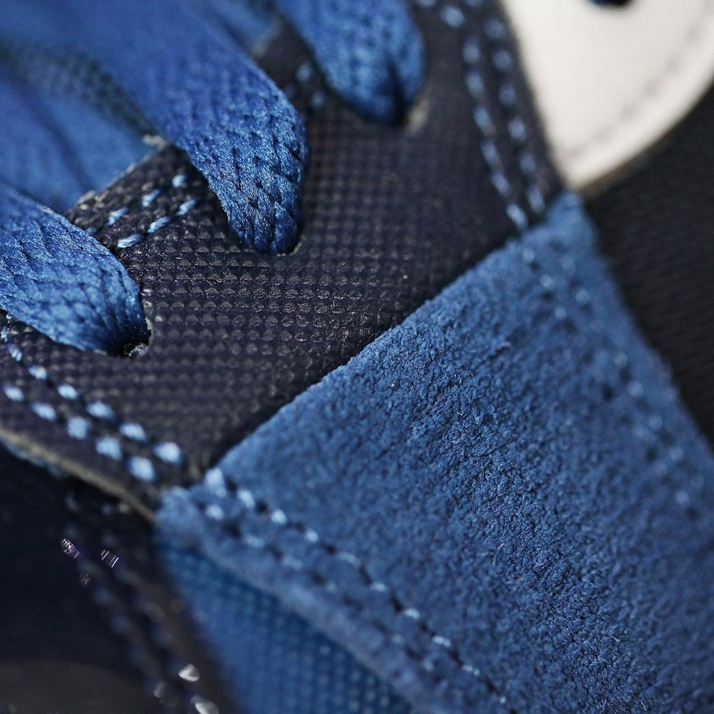 此次配色采用经典海军蓝搭配黑色进行呈现,鞋面包含多种不同质感的材质。