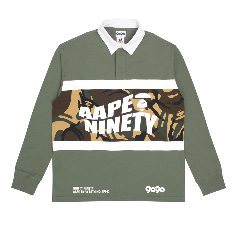 长袖 POLO 衫选择了黑色和抹茶色打造,在身体中间部分缀以 AAPE 经典的迷彩图案,为原本简约的造型增添了一抹细节。