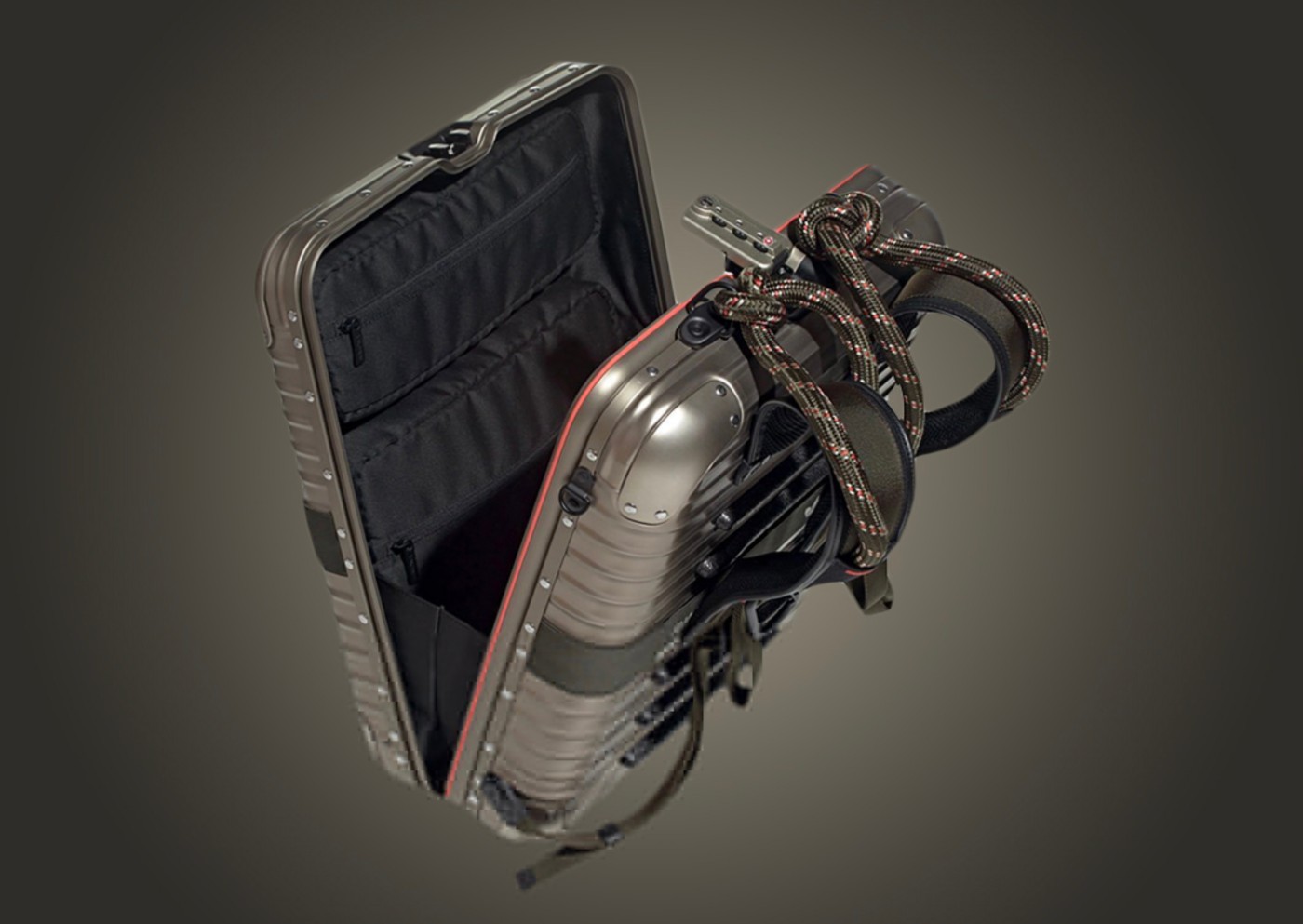 采用金属质感的棕咖色示人,橙色点缀细节。保留日默瓦经典登机箱造型的同时,采用双肩背设计呈现。