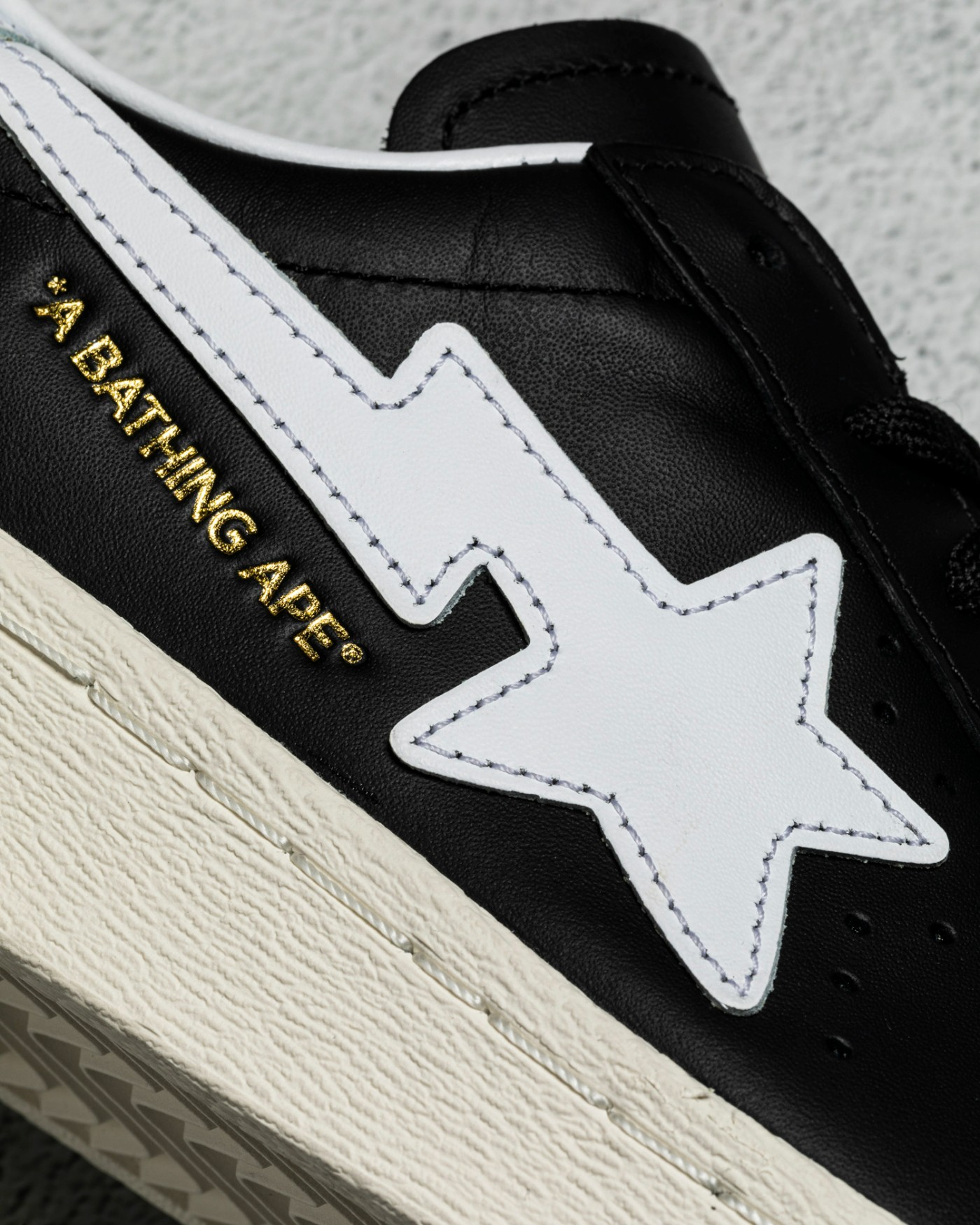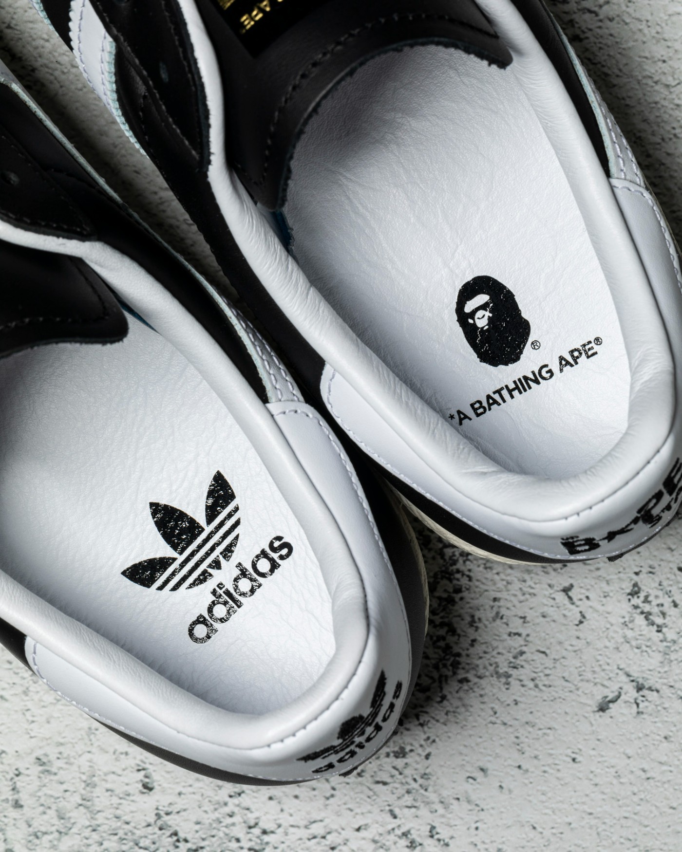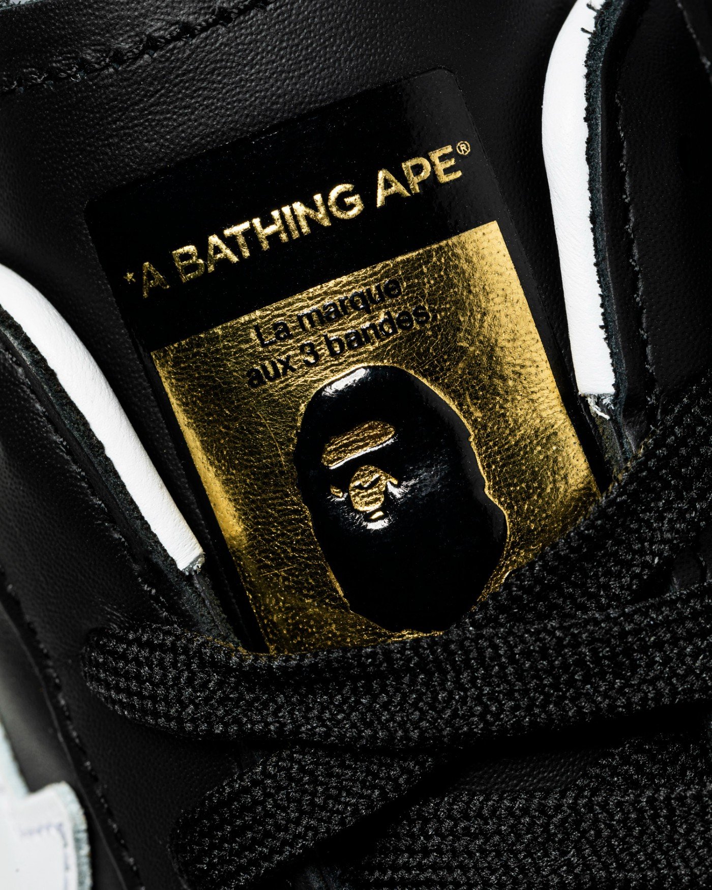 最有意思的是,两只鞋分别采用了 “顺边” 的设计,从左侧看是经典的三道杠造型,从右侧看则是 BAPE® 的流星 Logo。