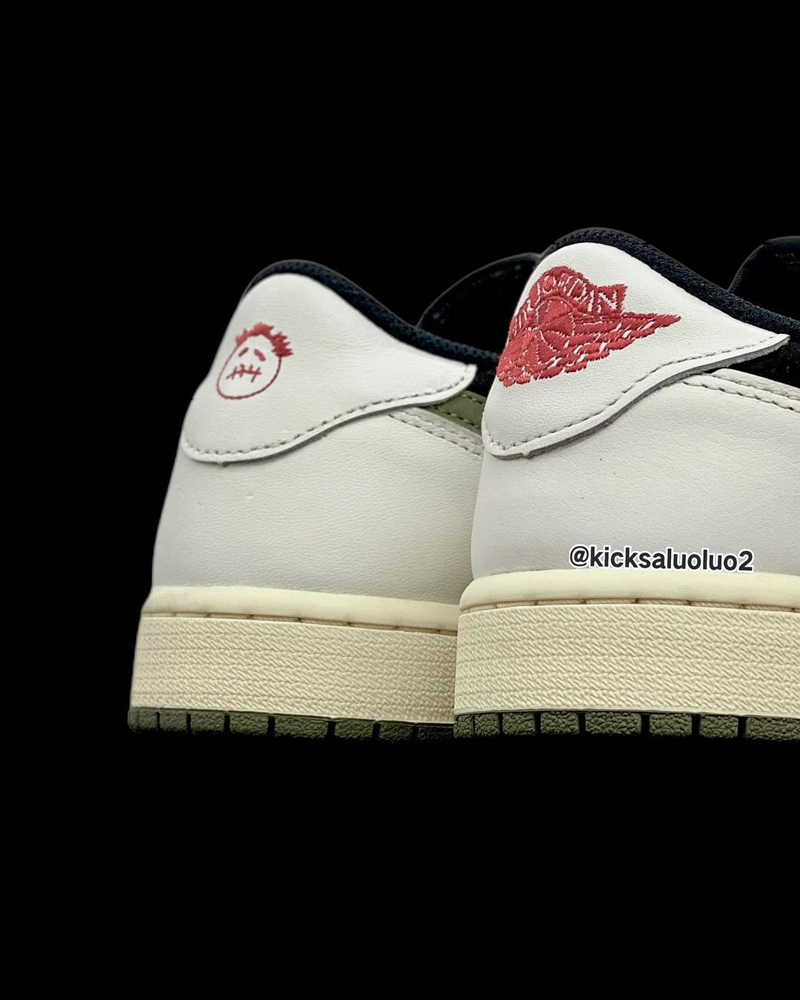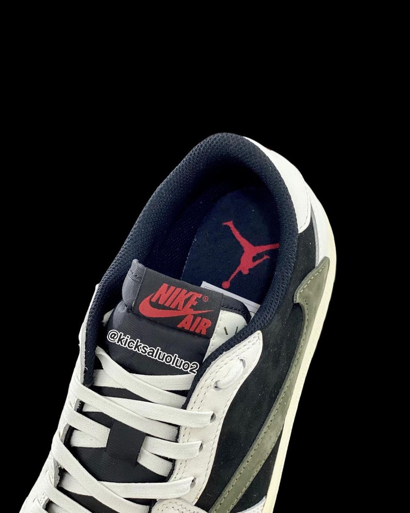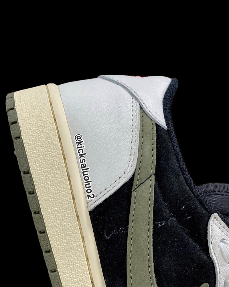 整双鞋采用黑白双色打造,侧面极具代表性的「反钩」以橄榄绿色点缀,营造出 Travis Scott 一贯的军事风格。
