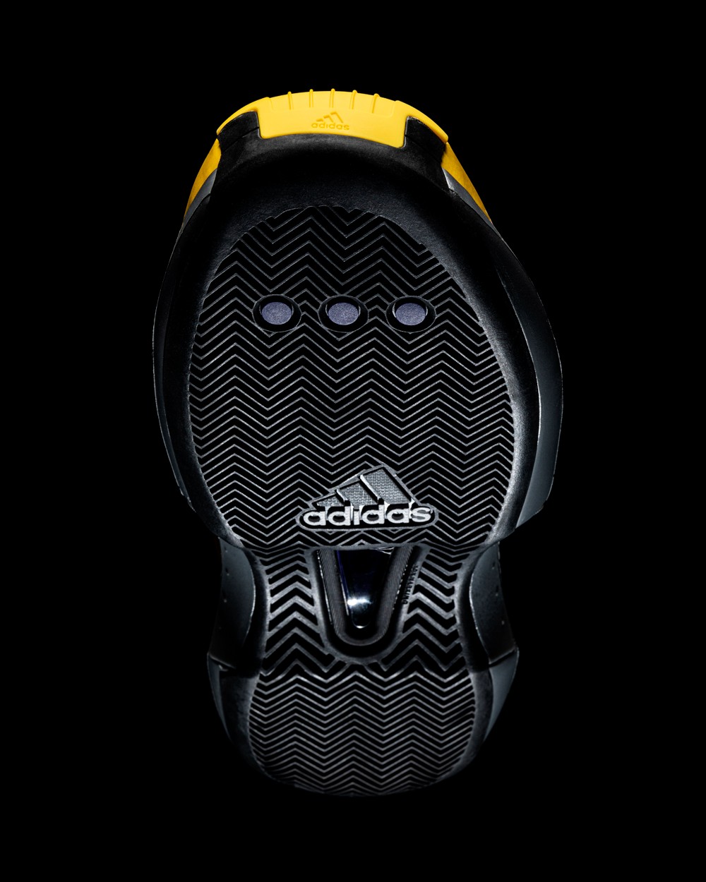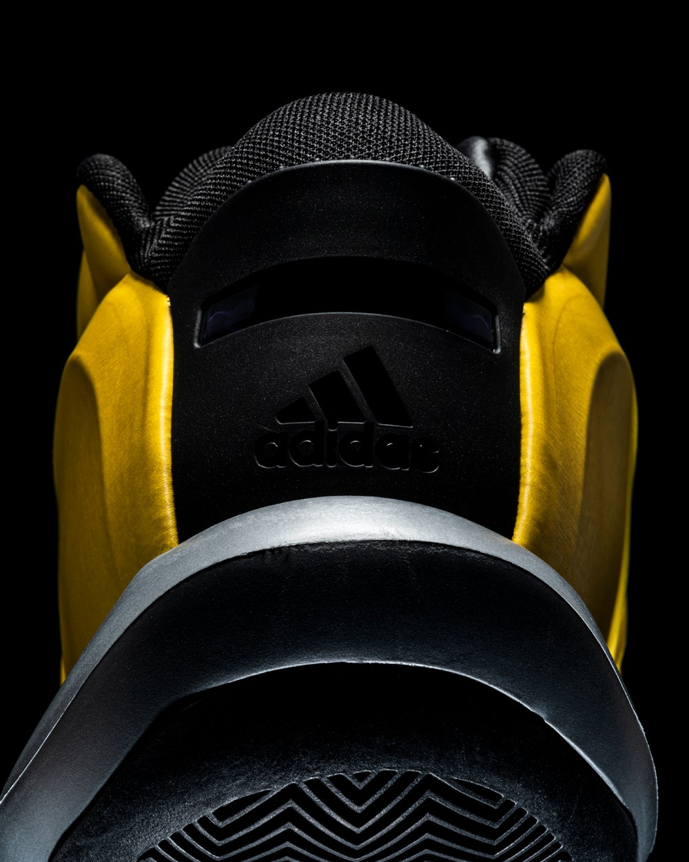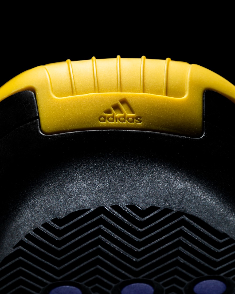 黄色的鞋面选用了乙烯基人造材料打造,以此来表现出鞋面的光滑质感,同时在侧身勾勒出 adidas 经典的三道杠 Logo。