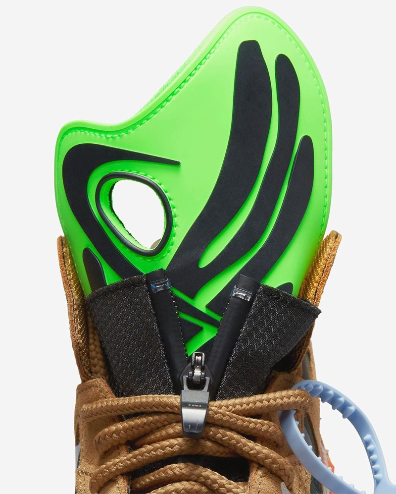 超大的荧光绿色鞋舌与鞋款本身形成了鲜明的对比,再加上熟悉的防调包扣和 OW 印刷文字,将联名身份展露无遗。