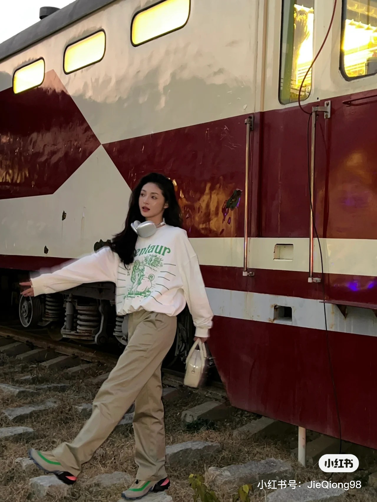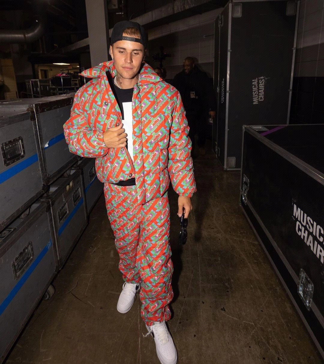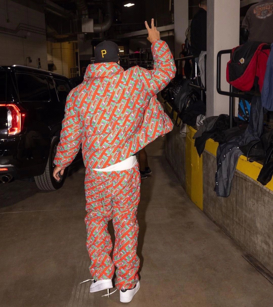 可能自己也知道这身行头不好配鞋,所以选择了一双黑白 Air Foce 1,目前市价在 ¥7xx 左右。