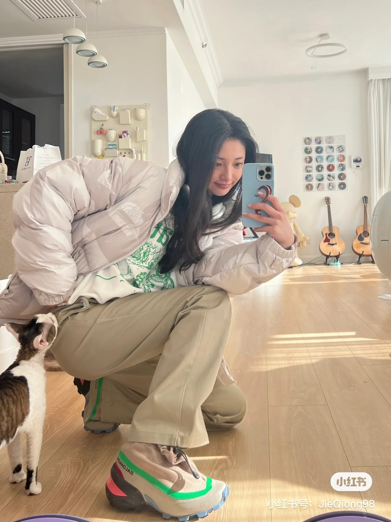 裤装搭配上选择了一条卡其色 Dickies 直筒裤,与鞋面网布颜色相呼应。