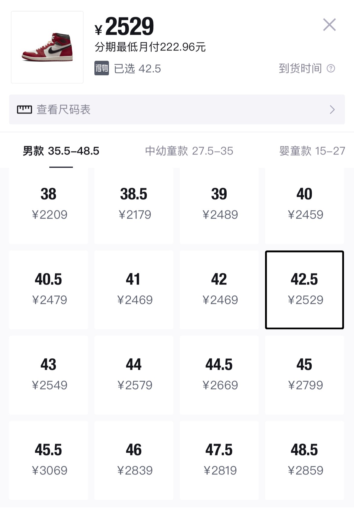 US9.5 对应国内 43 码的「芝加哥」Air Jordan 1 海外市价高达 $400 美元,不算运费的前提下折合人民币已经高达近¥3000 元了。